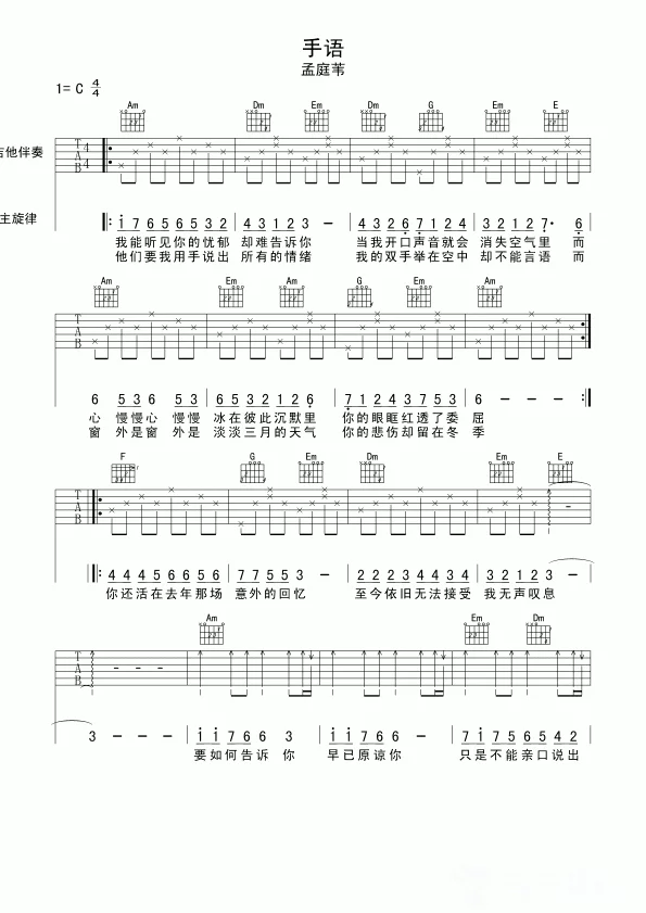 手语吉他谱 - 孟庭苇 - C调吉他弹唱谱