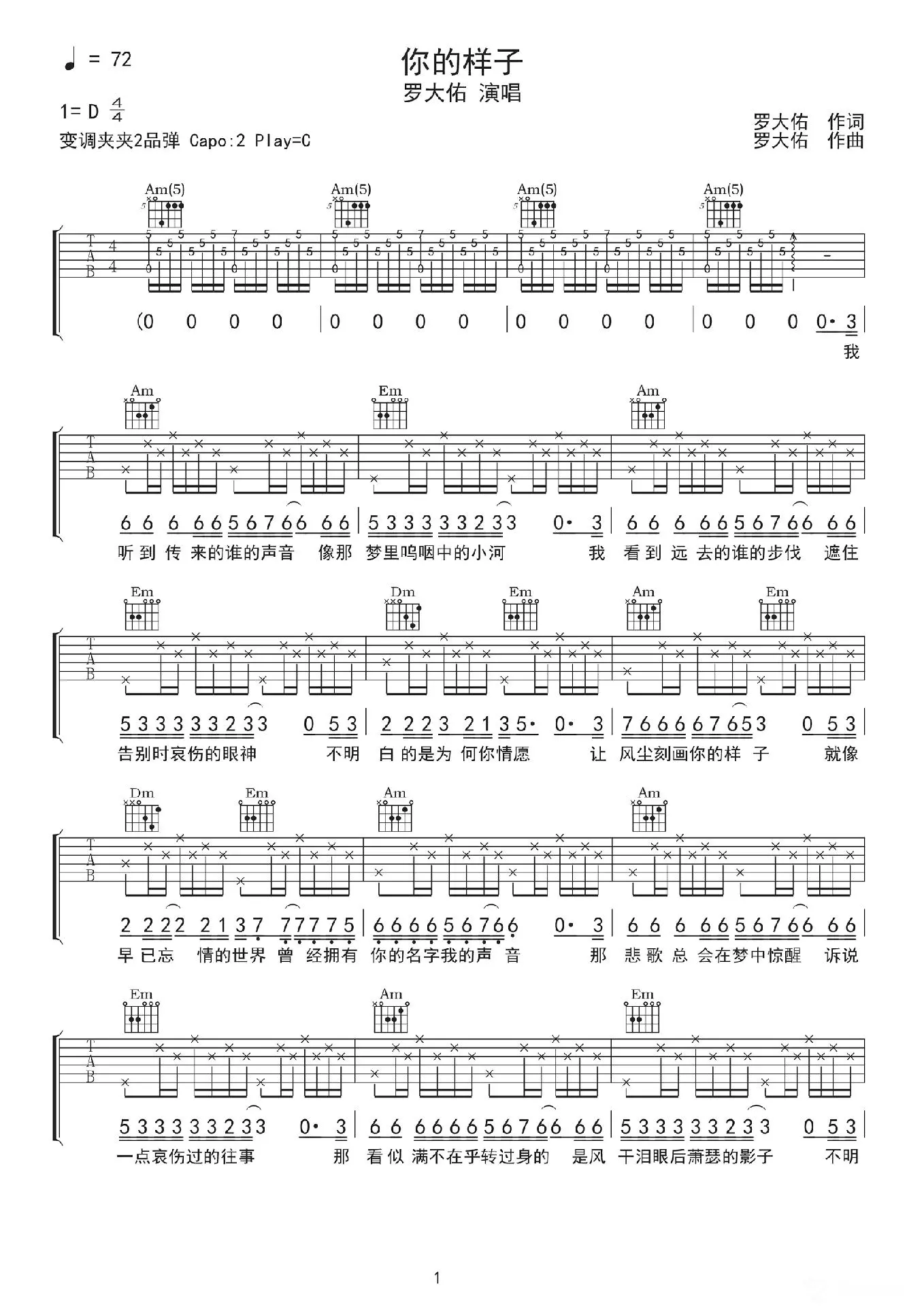 曲谱介绍: 罗大佐《你的样子》吉他弹唱谱,共有3张高清图谱。
