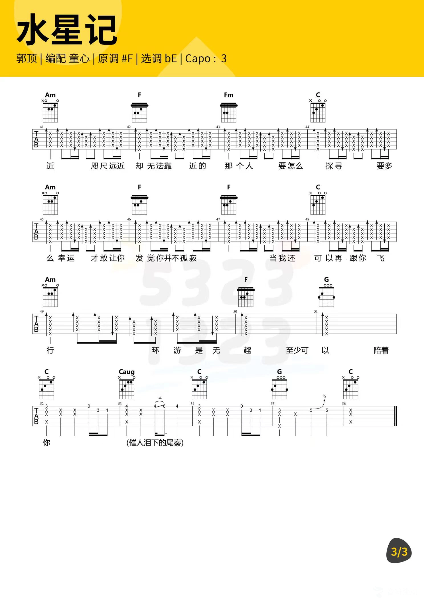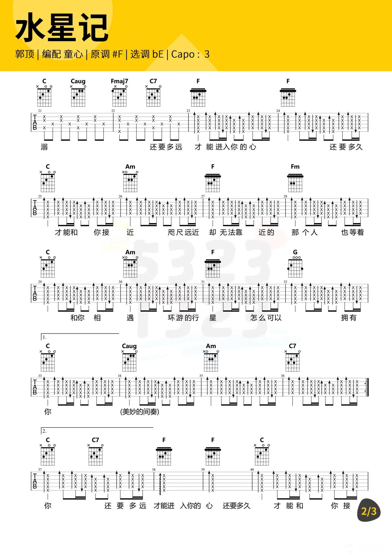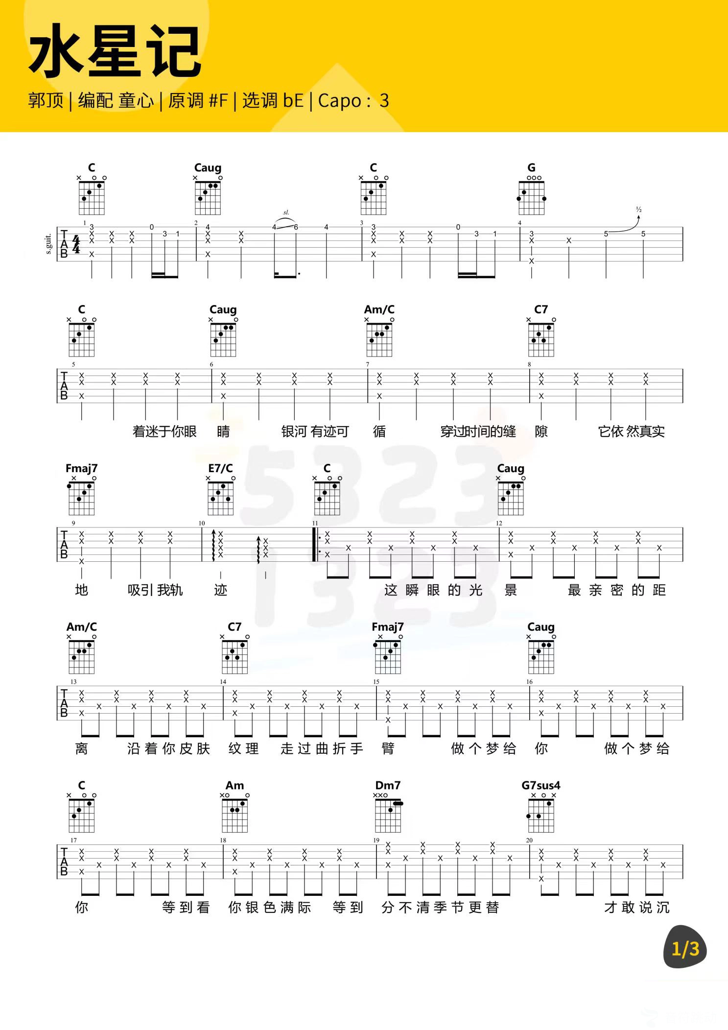 曲谱介绍: 芝麻《水星记》吉他弹唱谱,共有3张高清图谱。