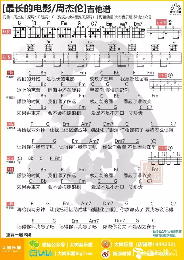 曲谱介绍: 大树《最长的电影》吉他弹唱谱,共有1张高清图谱,免翻页排版设计。