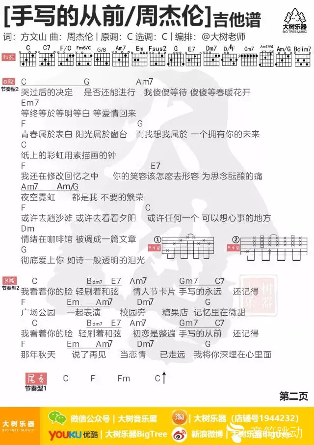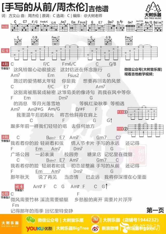 曲谱介绍: 周杰伦《手写的从前》吉他弹唱谱,共有2张高清图谱,免翻页排版设计。