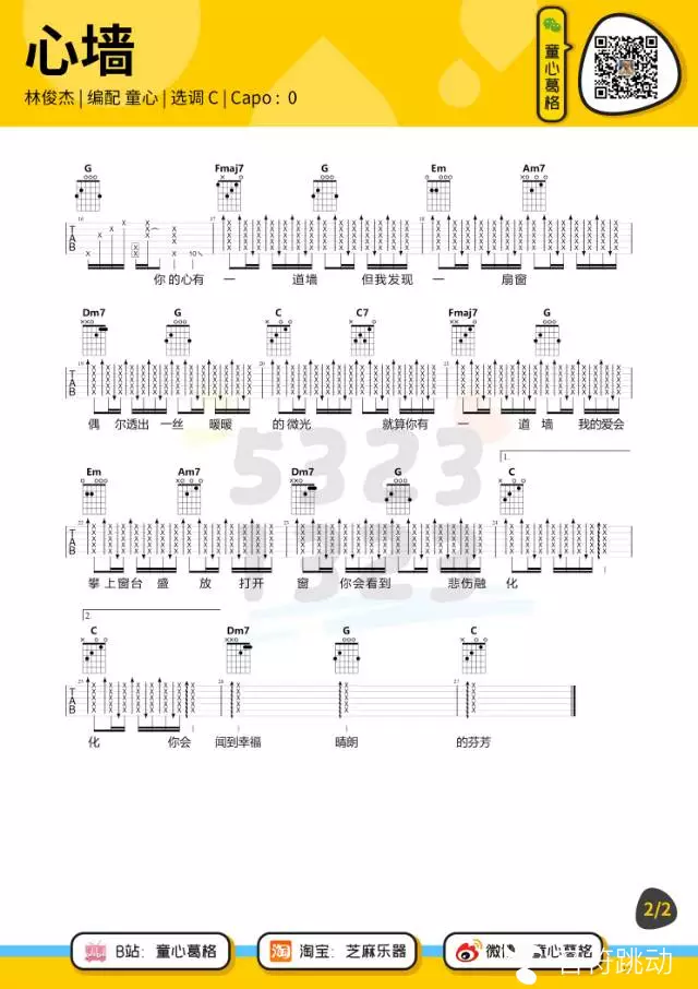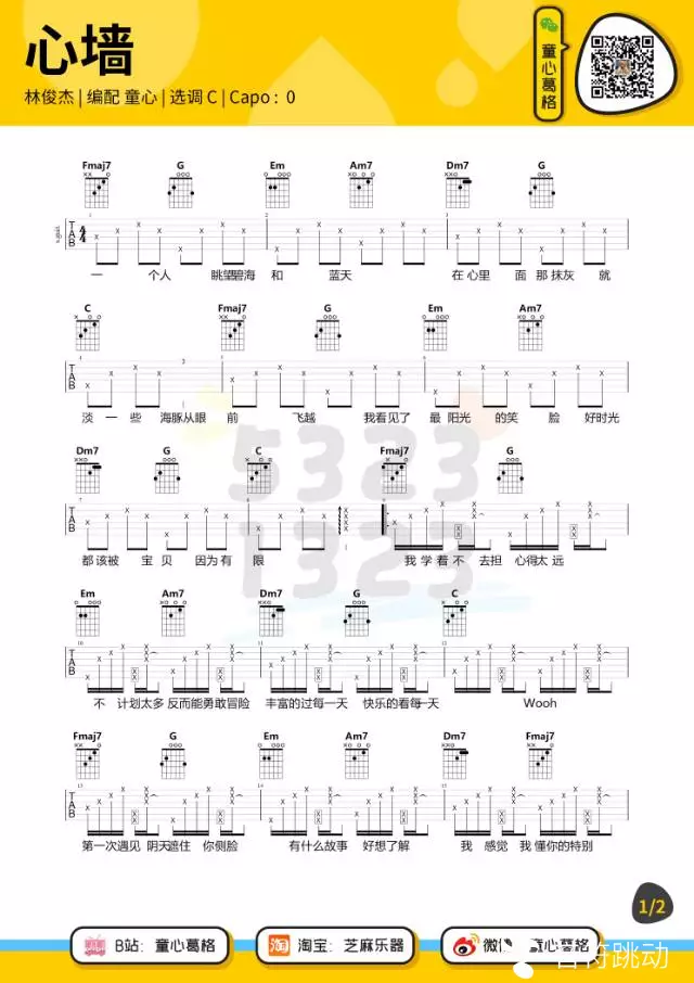 曲谱介绍: 林俊杰《心墙》吉他弹唱谱,共有2张高清图谱,免翻页排版设计。