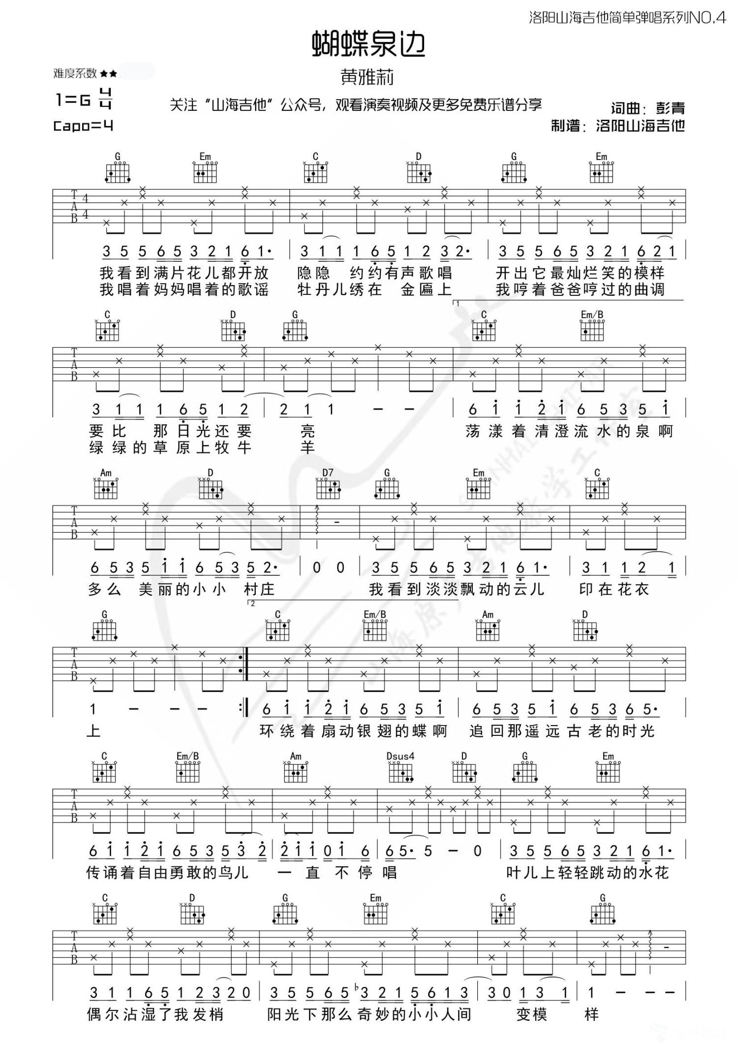 曲谱介绍: 黄雅莉《蝴蝶泉边》吉他弹唱谱,采用C调指法编配,共有1张高清图谱,免翻页排版设计。