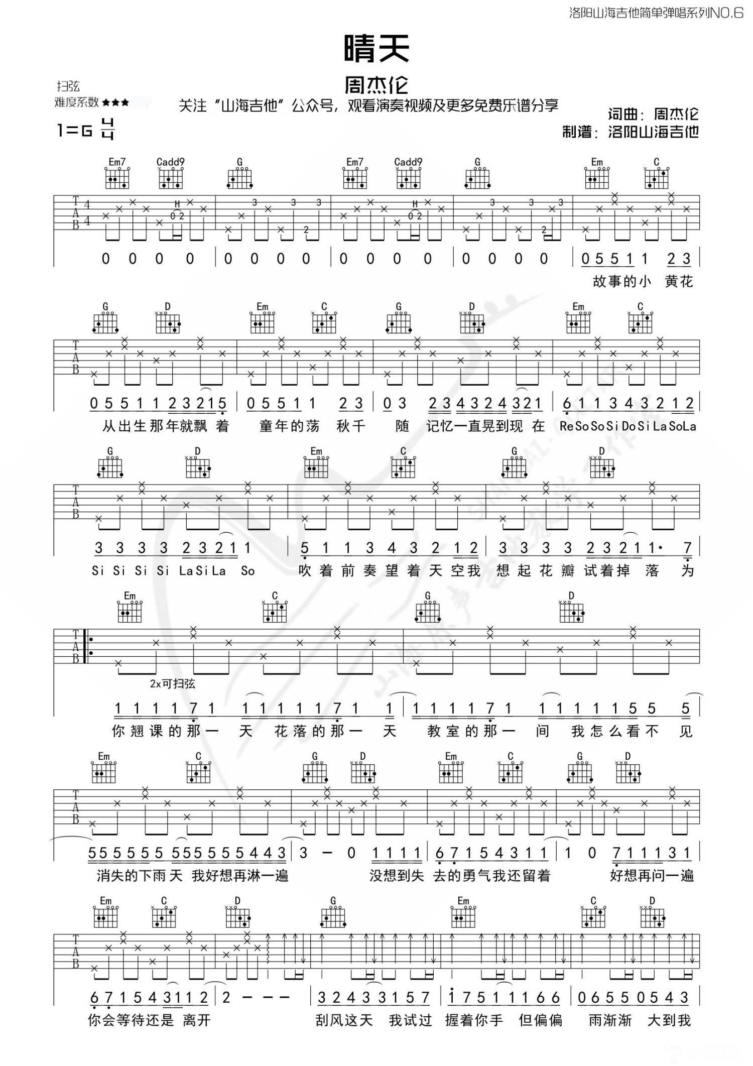 晴天吉他谱 - 周杰伦 - G调吉他弹唱谱