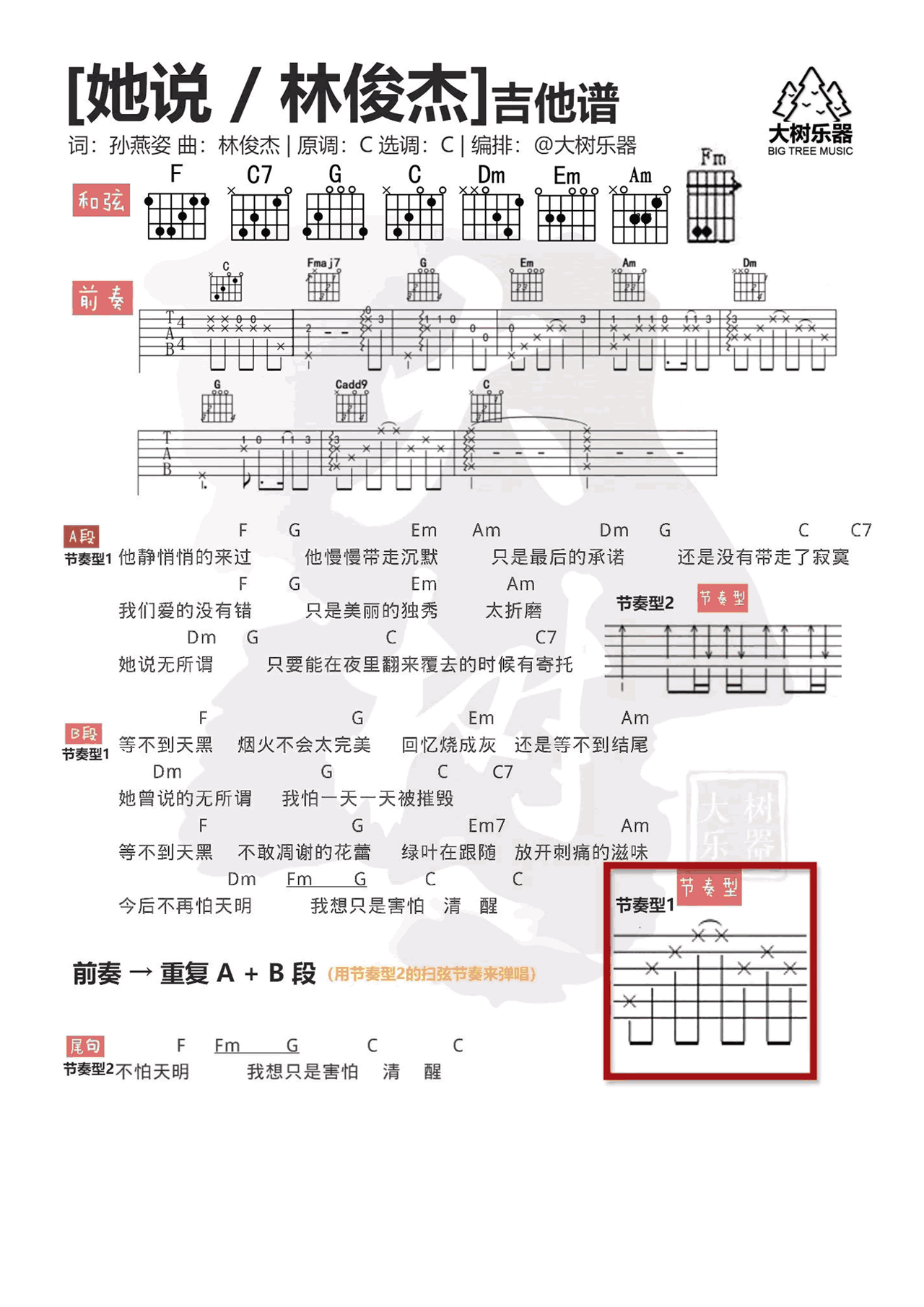 曲谱介绍: 《她说》吉他谱,林俊杰一首经典的情歌,她说吉他弹唱图片谱,带前奏编配。本曲谱选用原调C调,男生如果觉得唱的低了,可以使用变调夹夹第二品,女生不用夹变调夹
