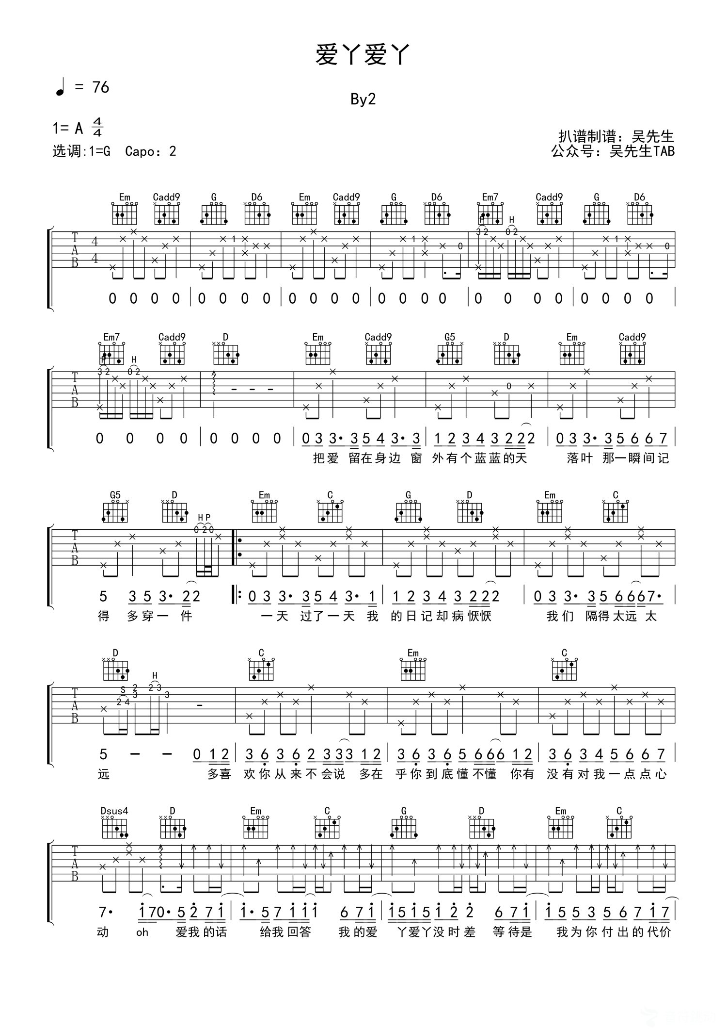 曲谱介绍: By2《爱丫爱丫》吉他弹唱谱,采用C调指法编配,吴先生TAB编配出品,共有2张高清图谱,免翻页排版设计。