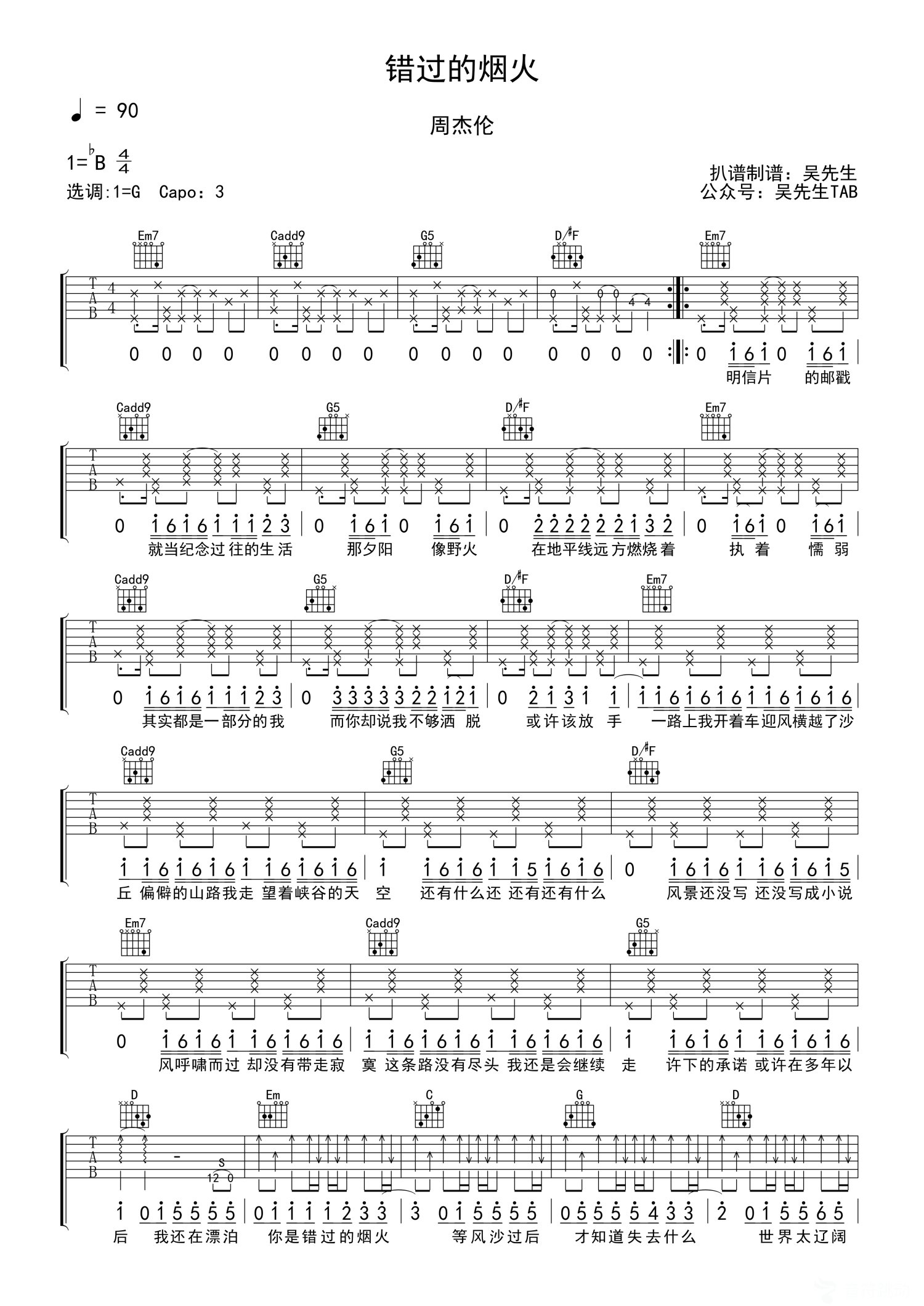 曲谱介绍: 周杰伦《错过的烟火》吉他弹唱谱,采用G调指法编配,吴先生TAB编配出品,共有2张高清图谱,免翻页排版设计。