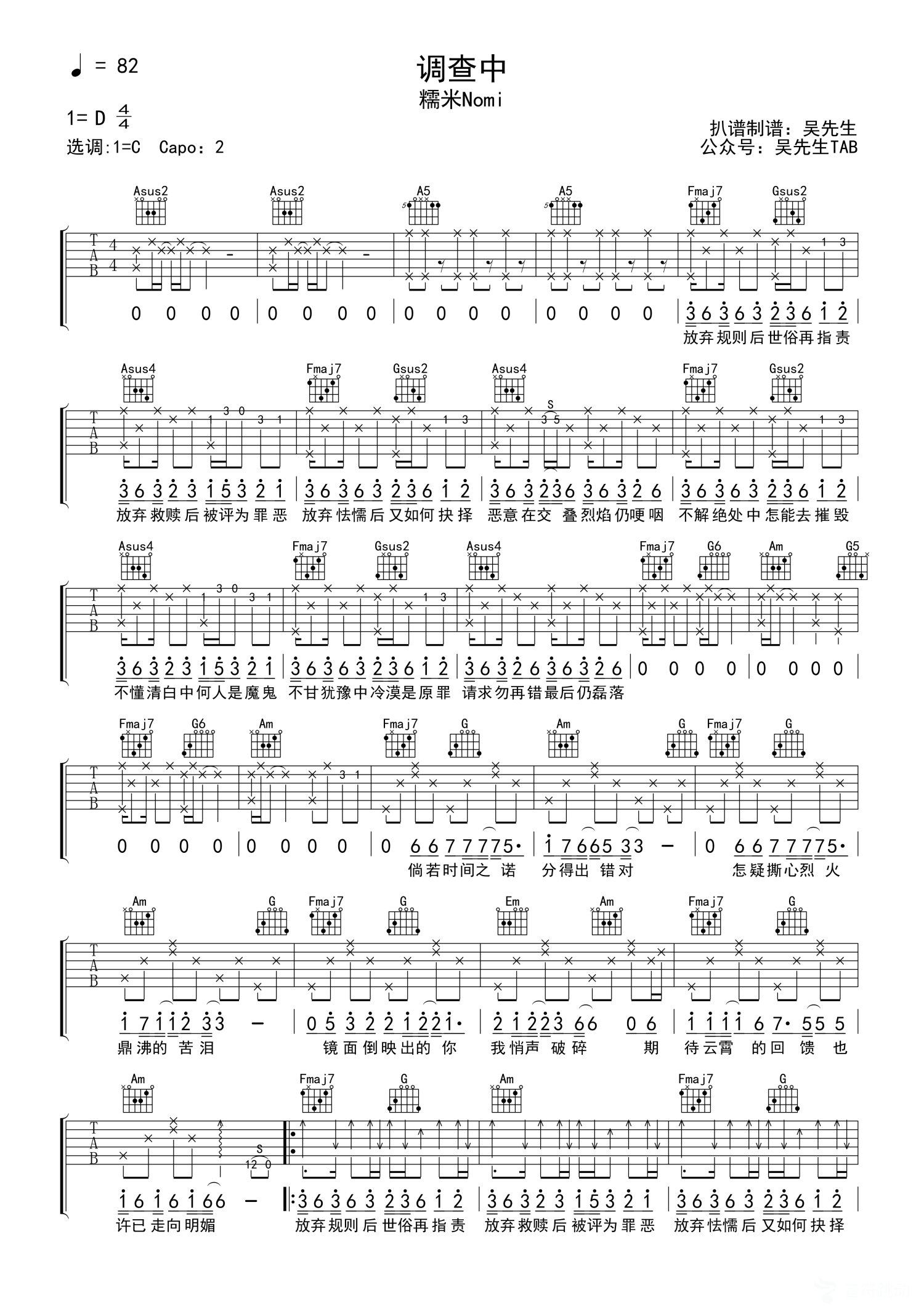曲谱介绍: 糯米Nomi《调查中》吉他弹唱谱,采用C调指法编配,吴先生TAB编配出品,共有2张高清图谱,免翻页排版设计。