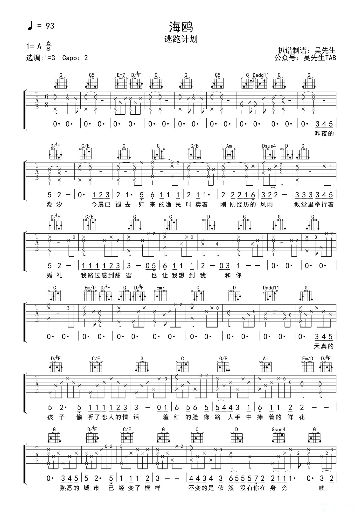 海鸥吉他谱 - 逃跑计划 - C调吉他弹唱谱