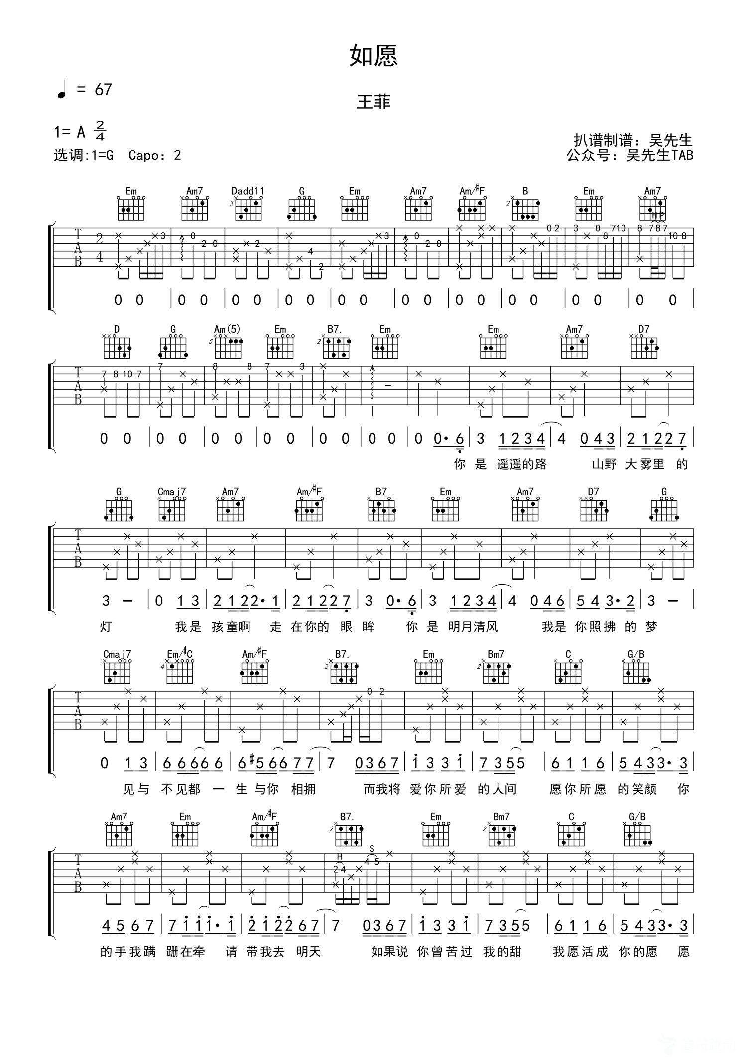 曲谱介绍: 王菲《如愿》吉他弹唱谱,采用C调指法编配,吴先生TAB编配出品,共有3张高清图谱。