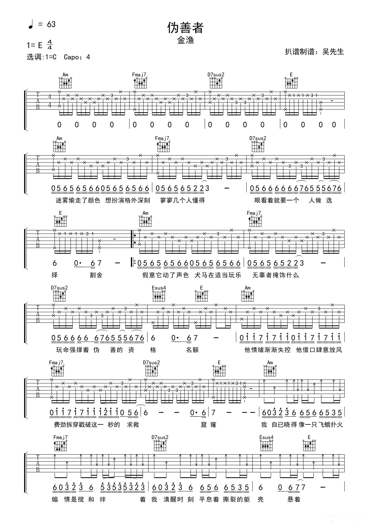 曲谱介绍: 金渔《伪善者》吉他弹唱谱,采用C调指法编配,吴先生TAB编配出品,共有2张高清图谱,免翻页排版设计。