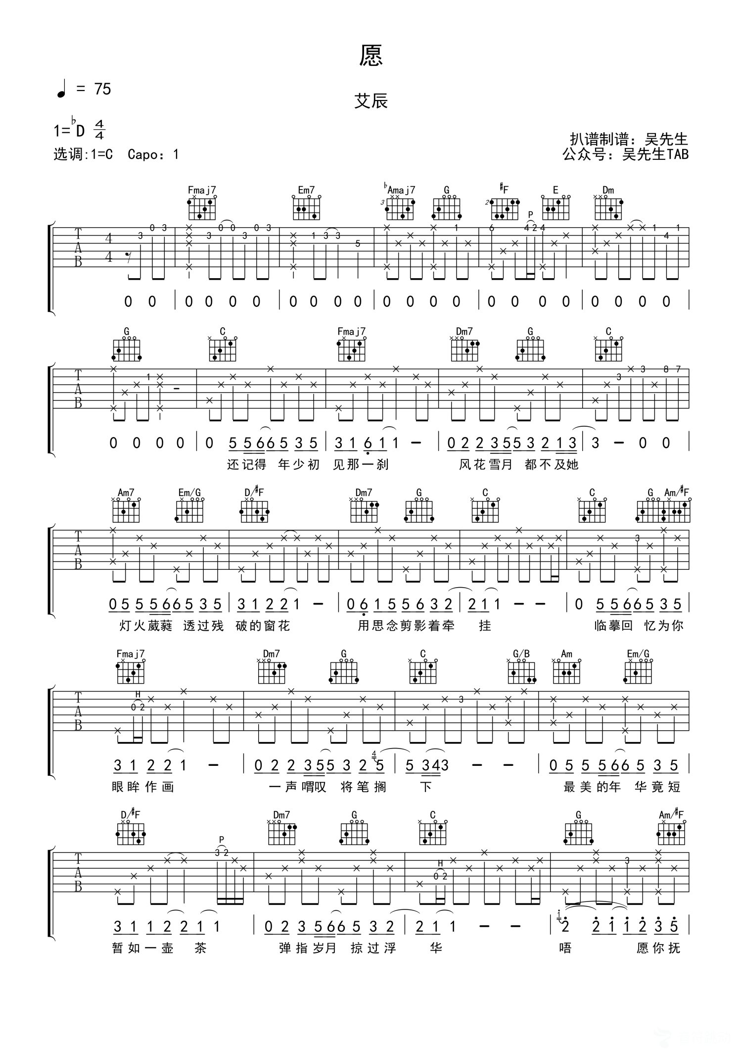 曲谱介绍: 王菲《愿》吉他弹唱谱,采用C调指法编配,吴先生TAB编配出品,共有3张高清图谱。