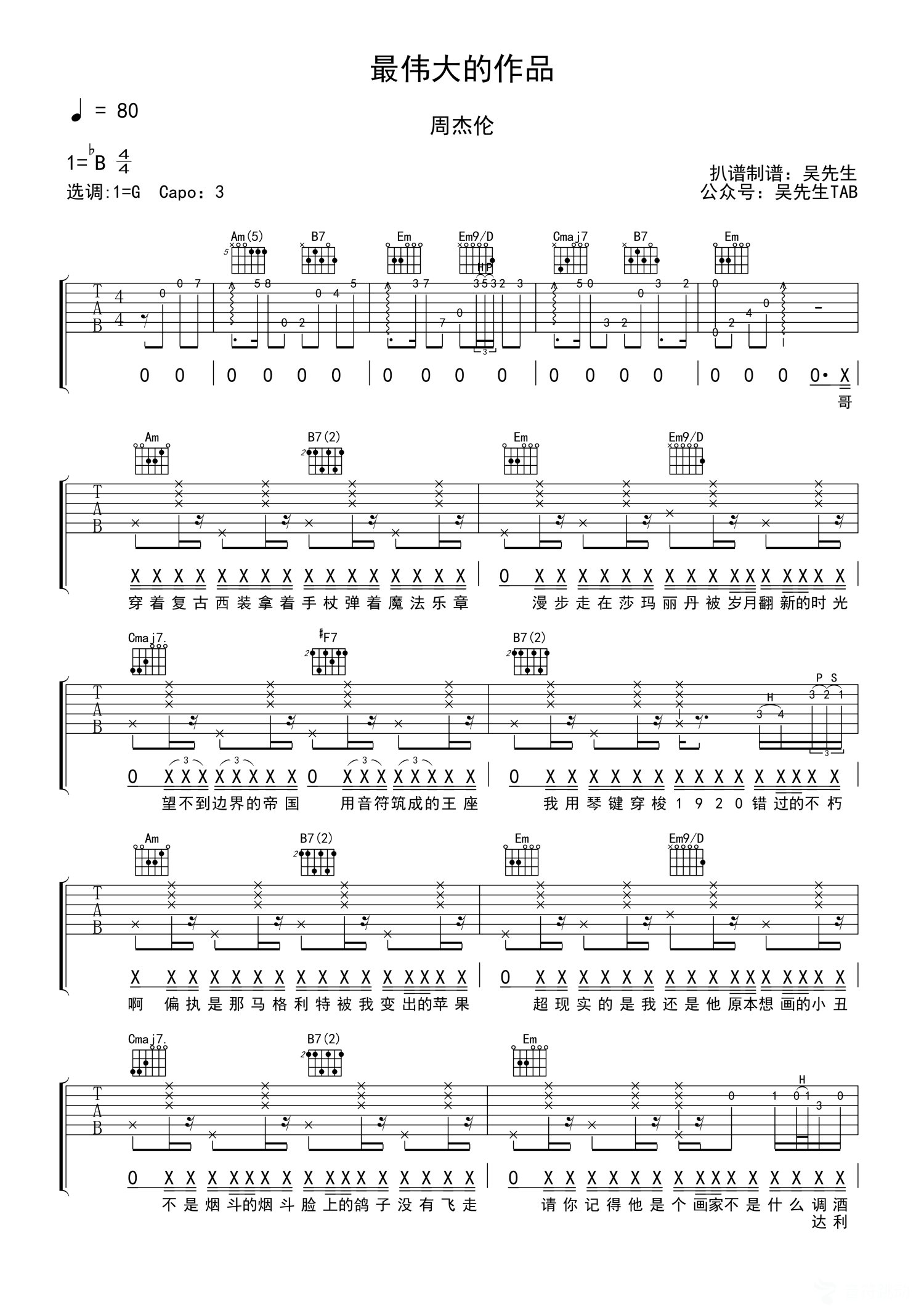 曲谱介绍: 周杰伦《最伟大的作品》吉他弹唱谱,采用C调指法编配,吴先生TAB编配出品,共有4张高清图谱。