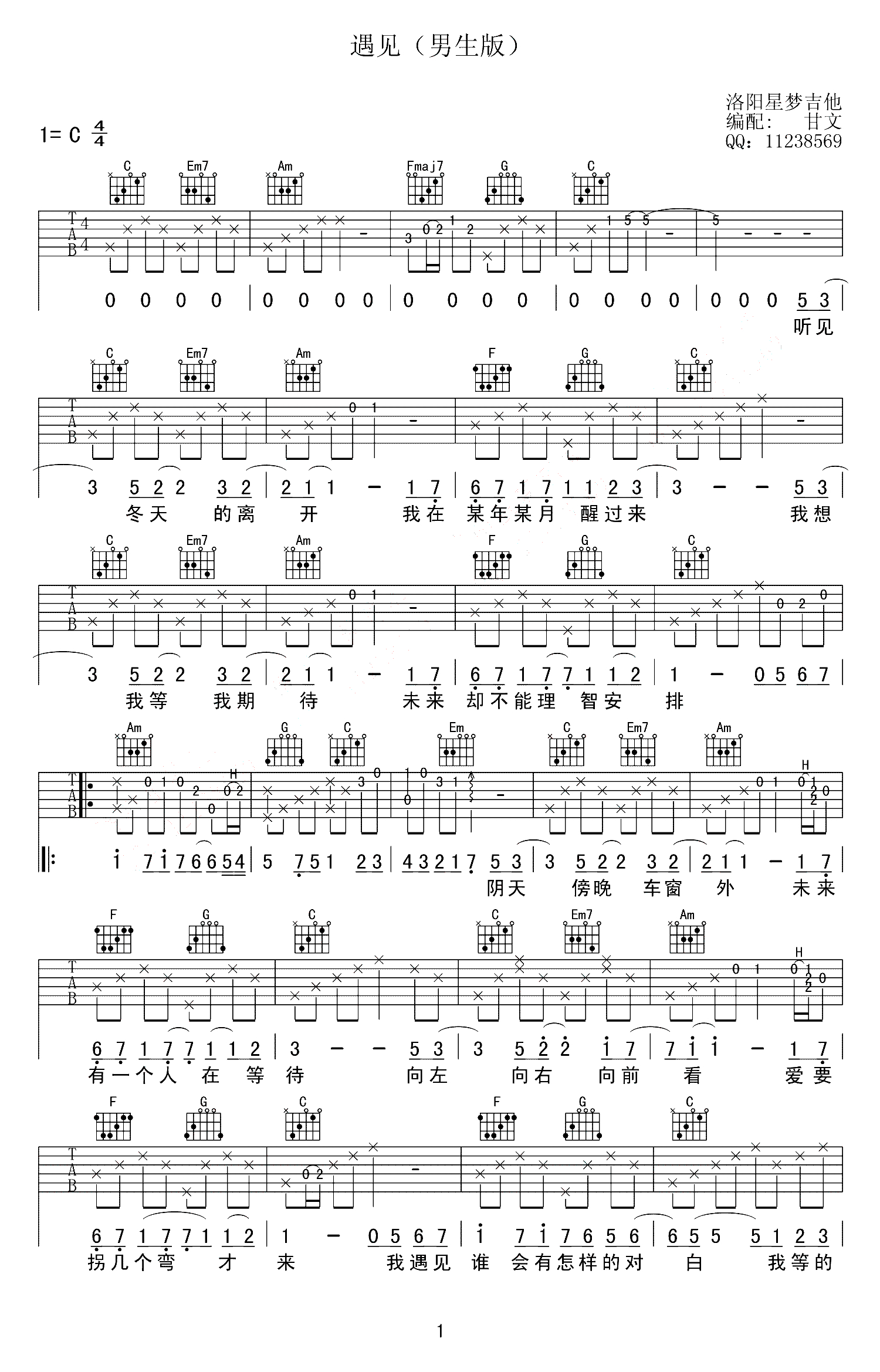 遇见吉他谱 - 孙燕姿 - C调吉他弹唱谱 - 男生版