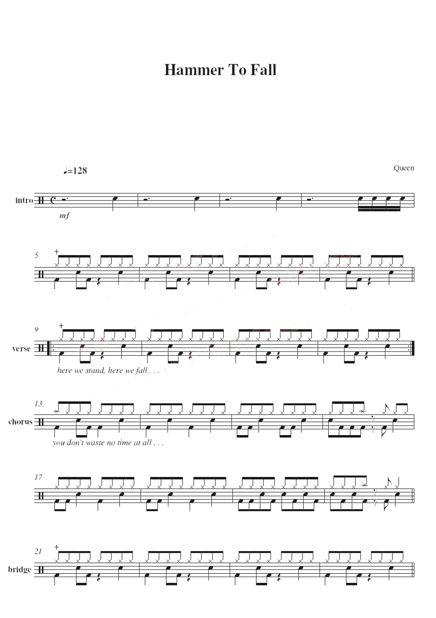 曲谱介绍: Hammer to Fall(架子鼓谱)-Queen