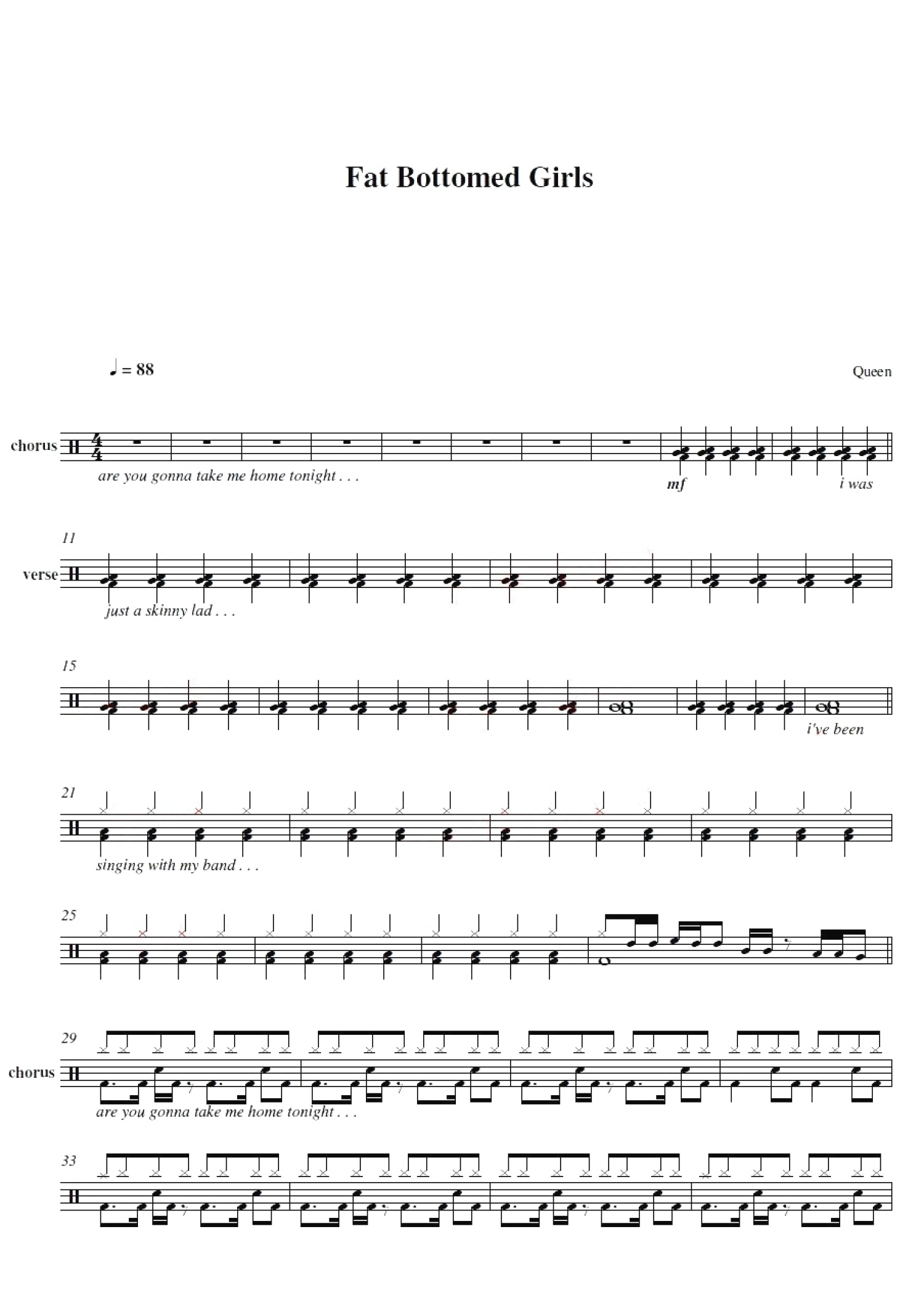 Fat Bottomed Girl鼓谱 - Queen - 架子鼓谱