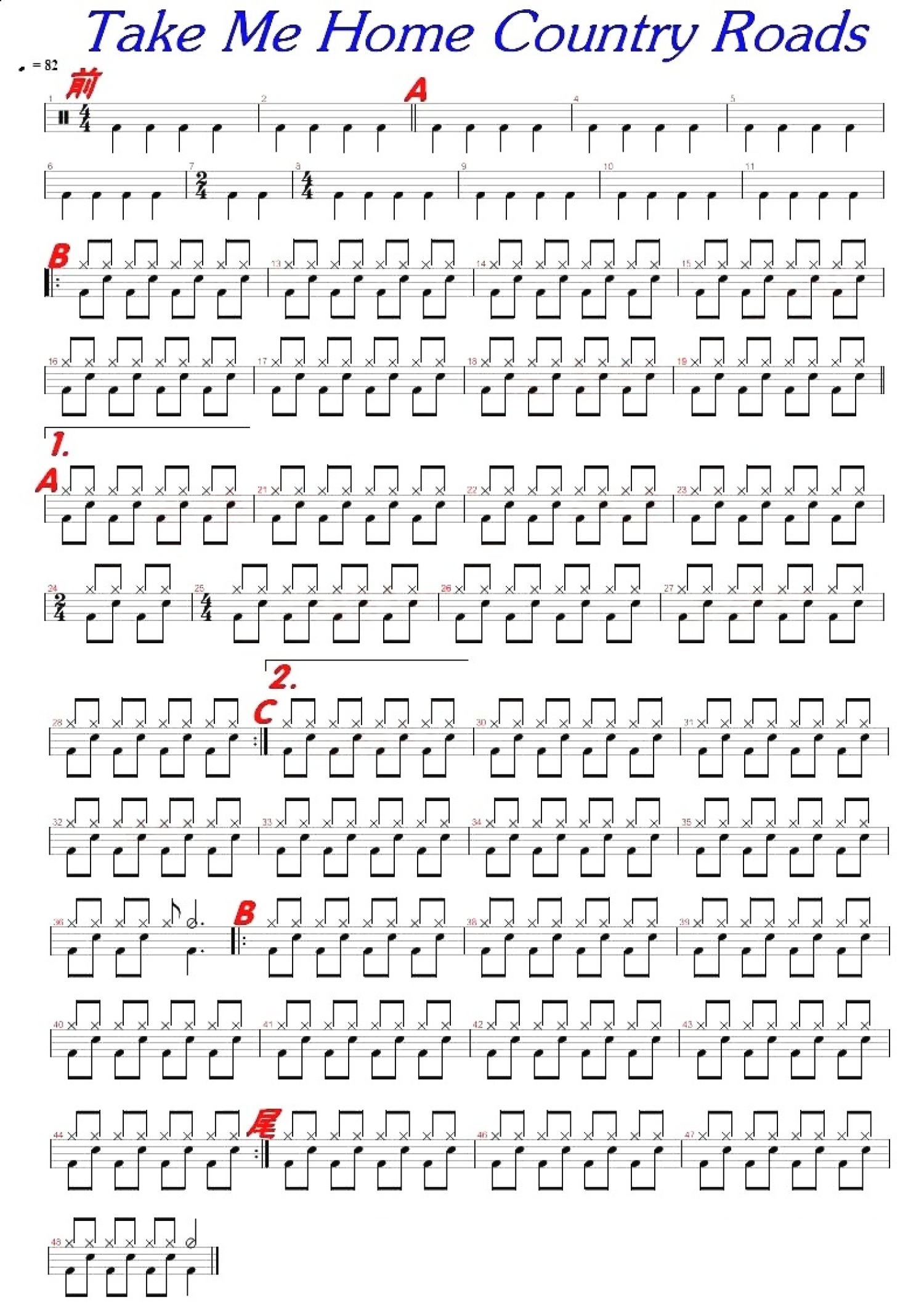 曲谱介绍: Take Me Home Country Roads(架子鼓谱)-John Denver