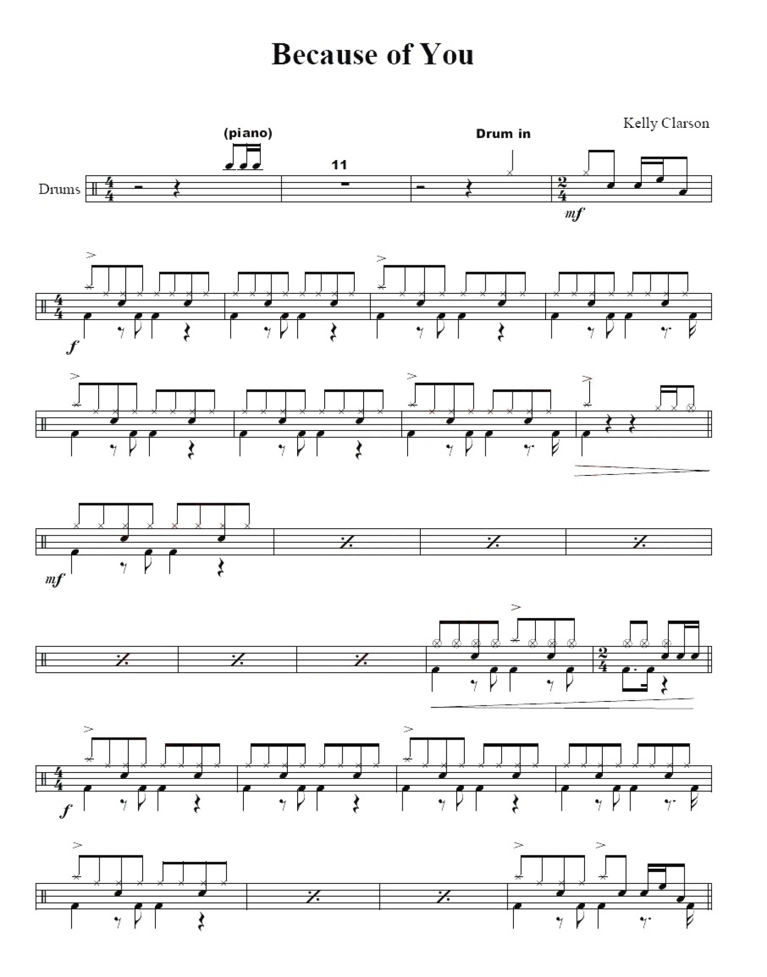 曲谱介绍: Because Of You(架子鼓谱)-Kelly Clarkson