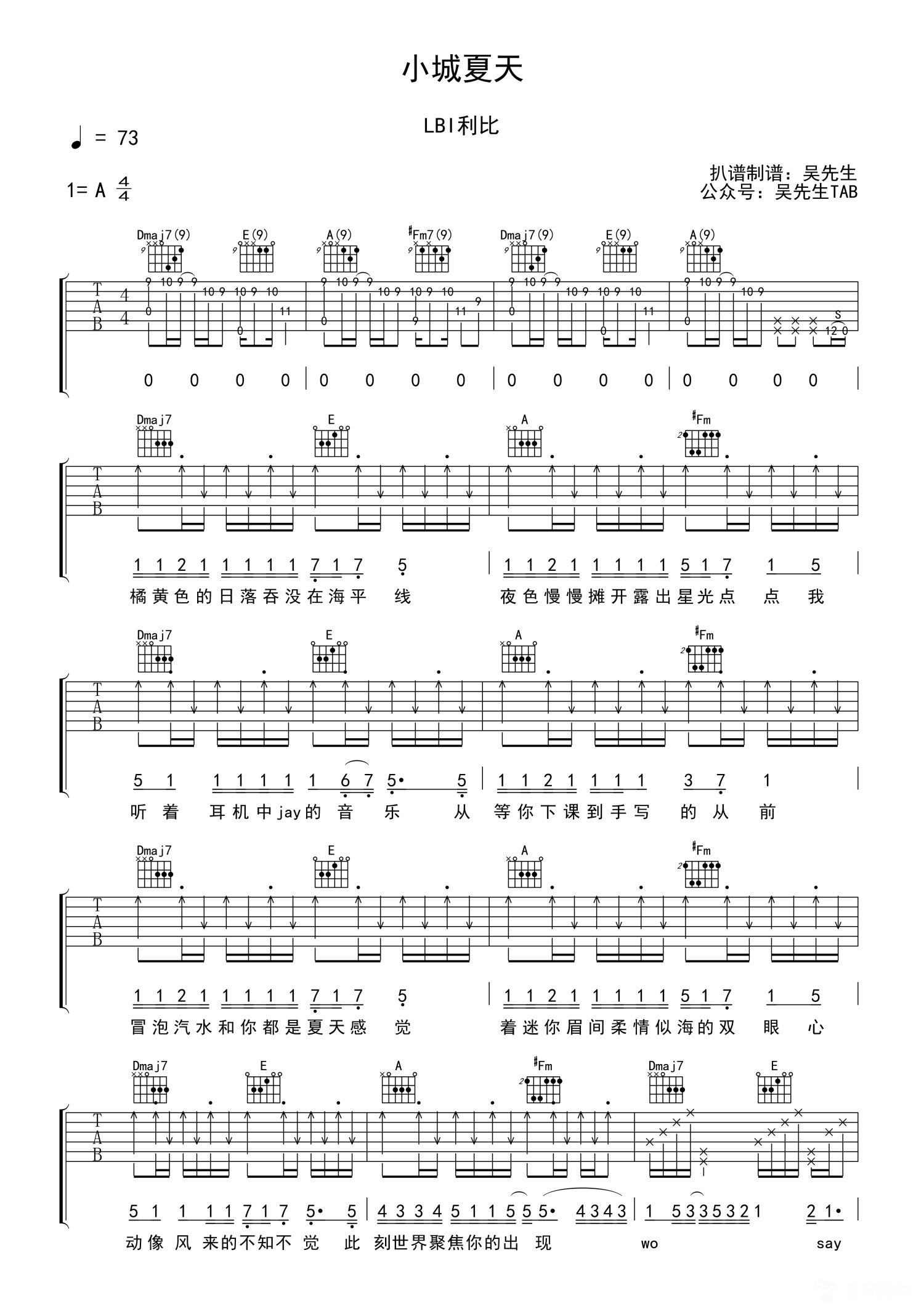 曲谱介绍: LBI利比《小城夏天》吉他弹唱谱,采用C调指法编配,吴先生TAB编配出品,共有2张高清图谱,免翻页排版设计。