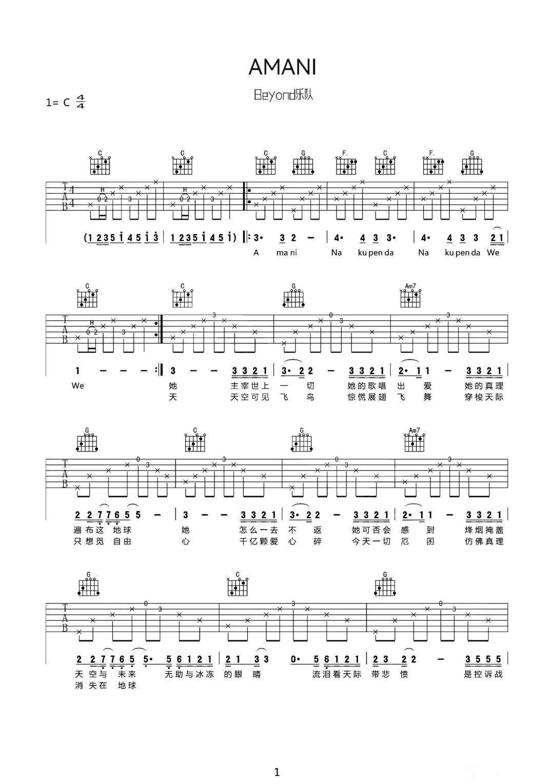 AMANI吉他谱 - BEYOND - C调吉他弹唱谱