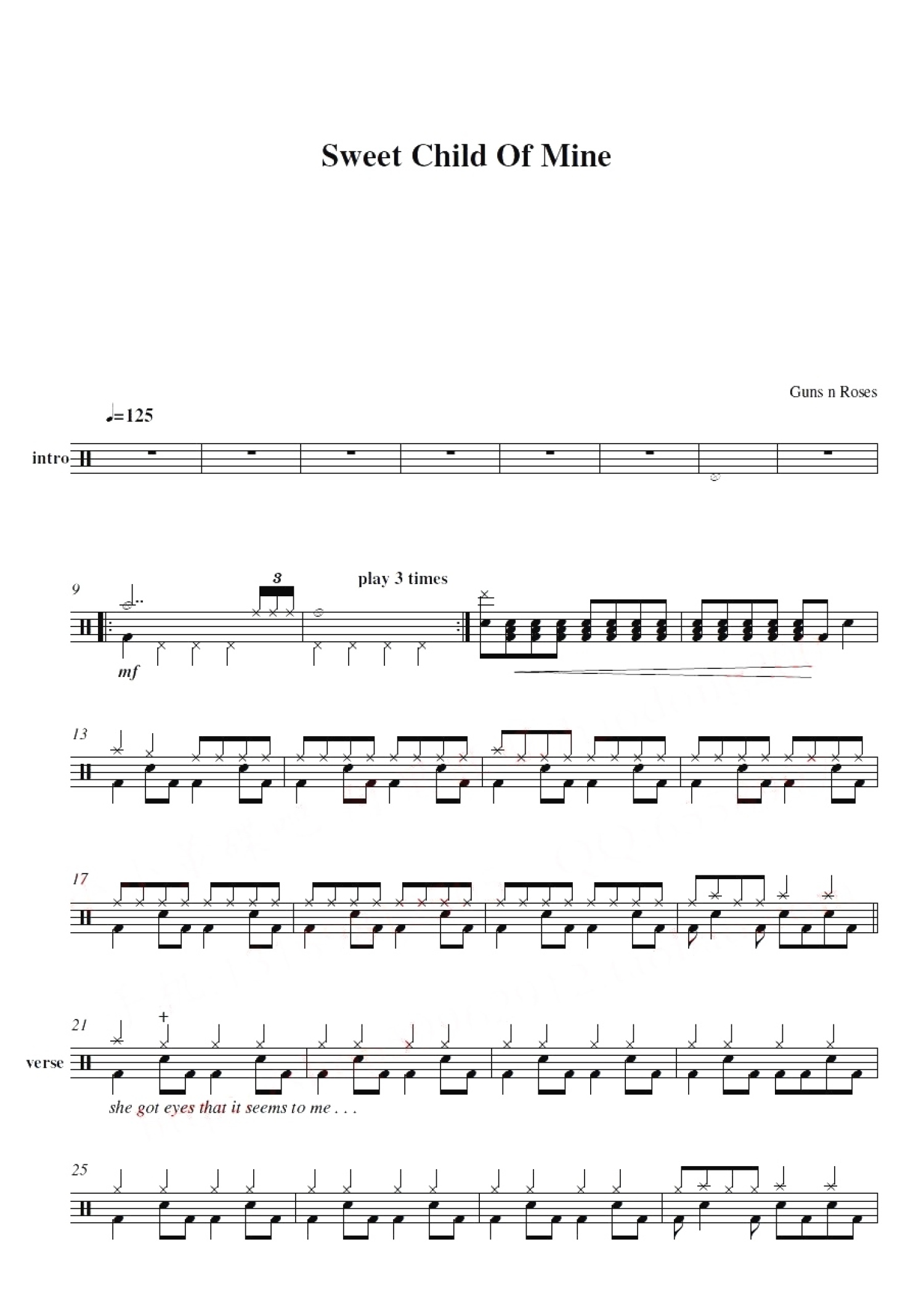 曲谱介绍: Sweet Child O'Mine【可爱的孩子】(架子鼓谱)-Guns N Roses枪支玫瑰