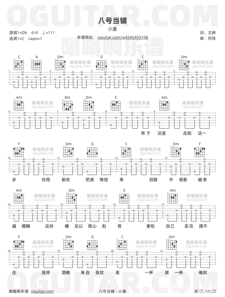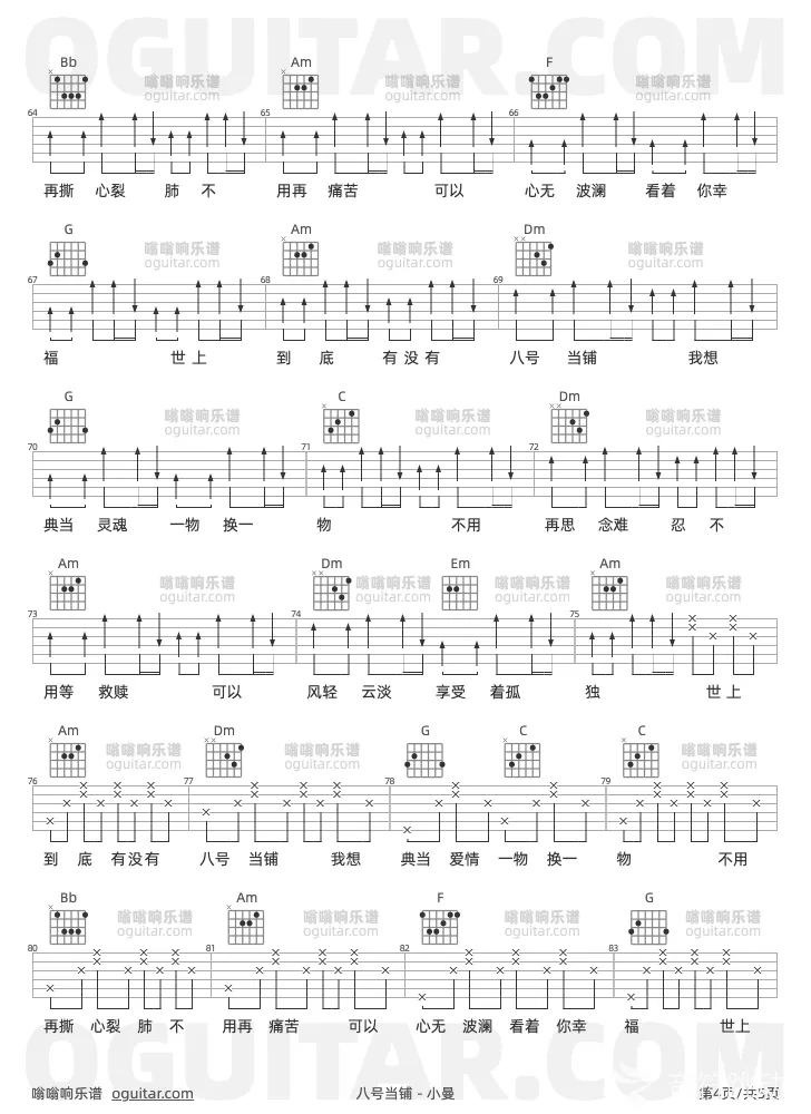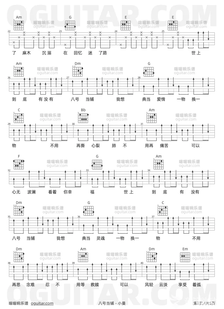 曲谱介绍: 小曼《八号当铺》吉他弹唱谱,共有5张高清图谱,免翻页排版设计。