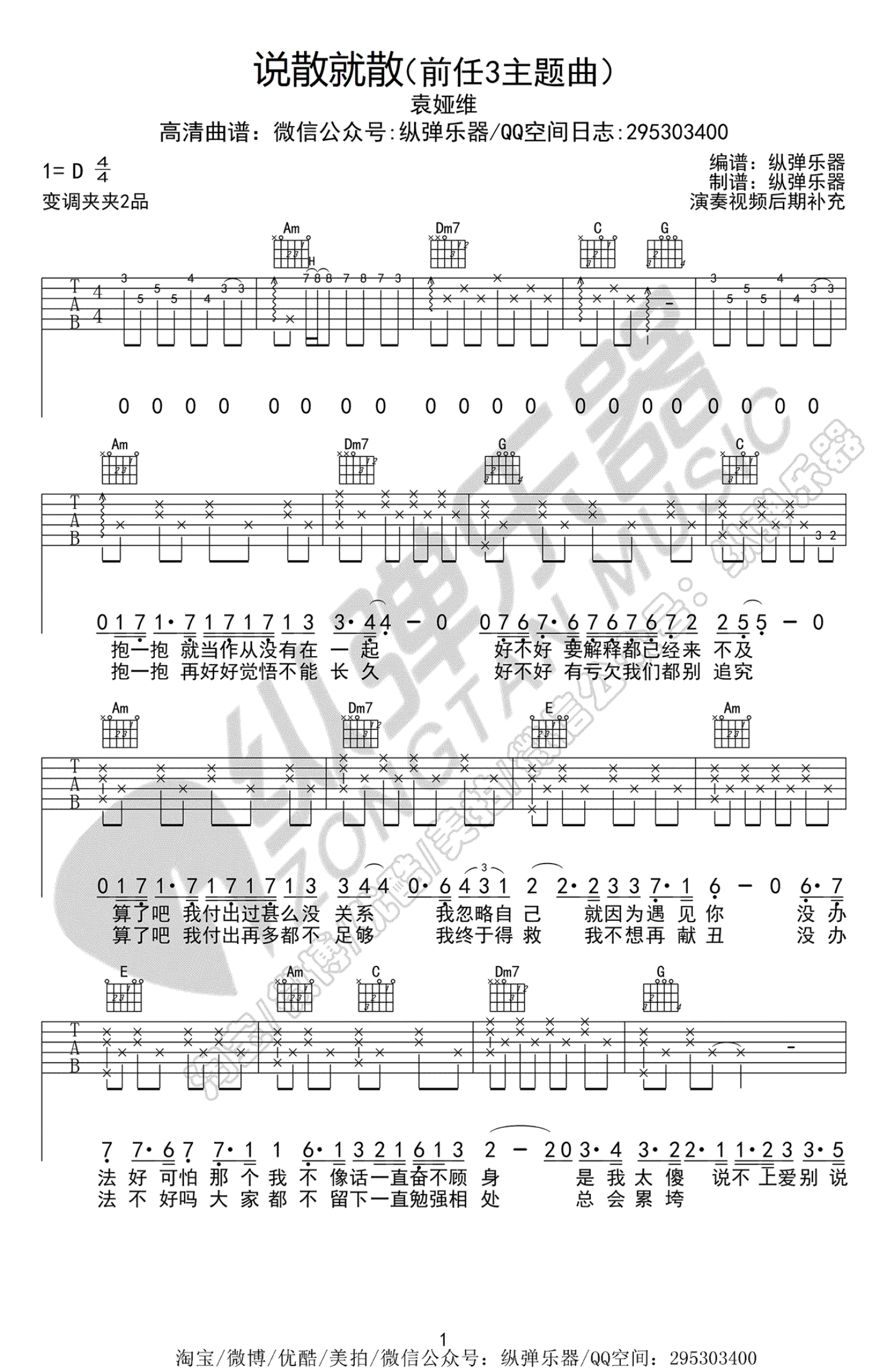 曲谱介绍: 袁娅维《说散就散》吉他谱,D调,变调夹夹第二品,电影《前任3》主题曲。无力回天的哭泣,生无可恋的倾靠。无疑,很多人都经历了这说散就散的故事。真正的离开总是悄无声息的。既然你爱Ta,就要在分开时,给一个拥抱,说一句再见,不是说散就散,不要说散就散。