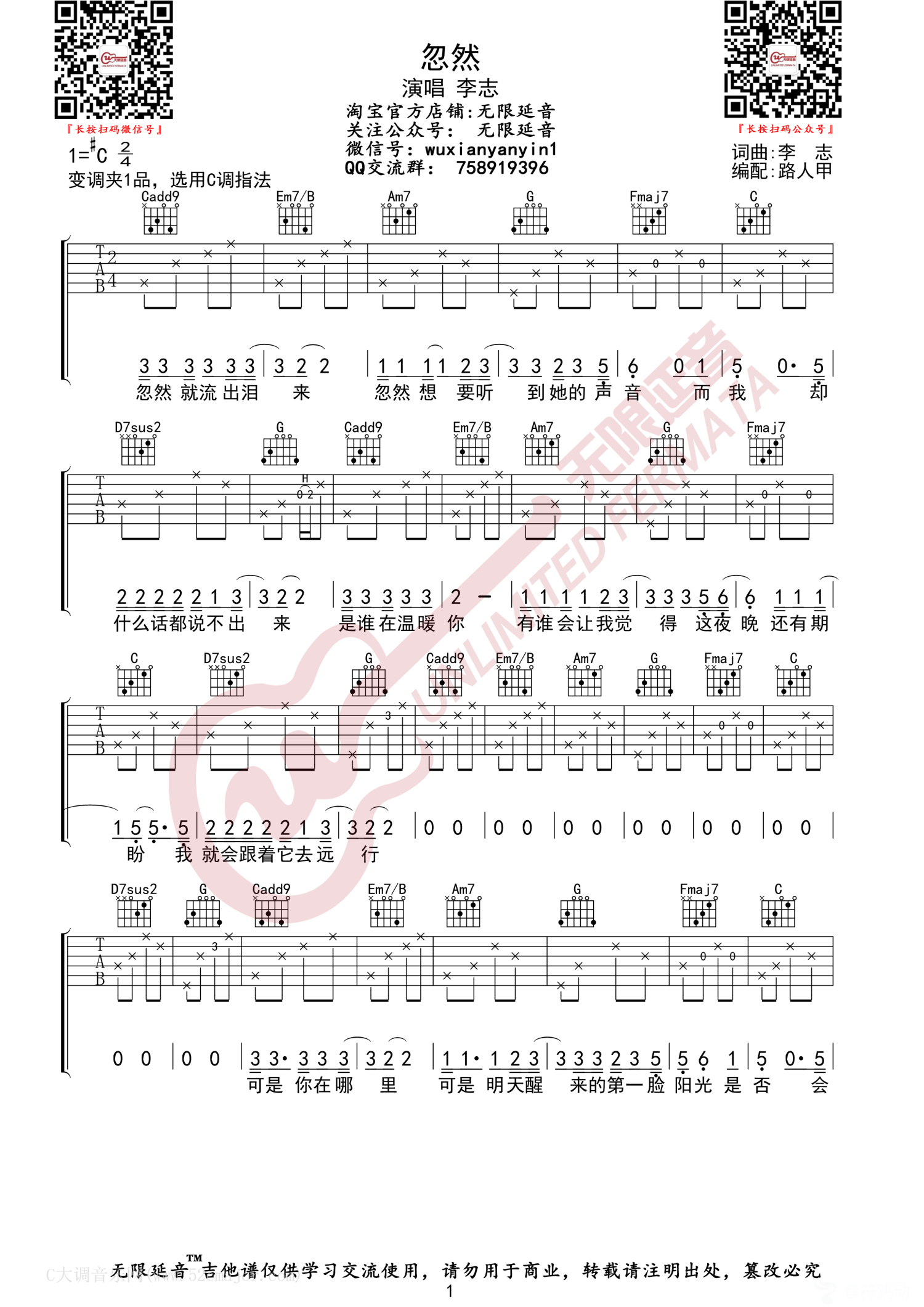 曲谱介绍: 李志《忽然》吉他弹唱谱,采用C调指法编配,无限延音编配出品,共有2张高清图谱,免翻页排版设计。