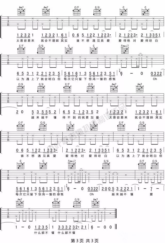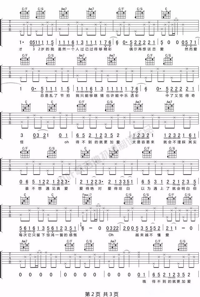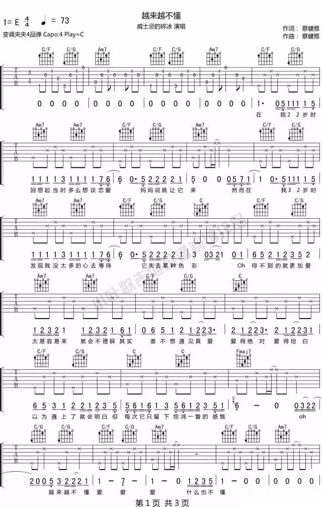 曲谱介绍: 沈以诚《越来越不懂》吉他弹唱谱,共有3张高清图谱。