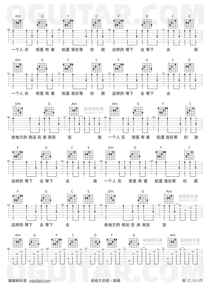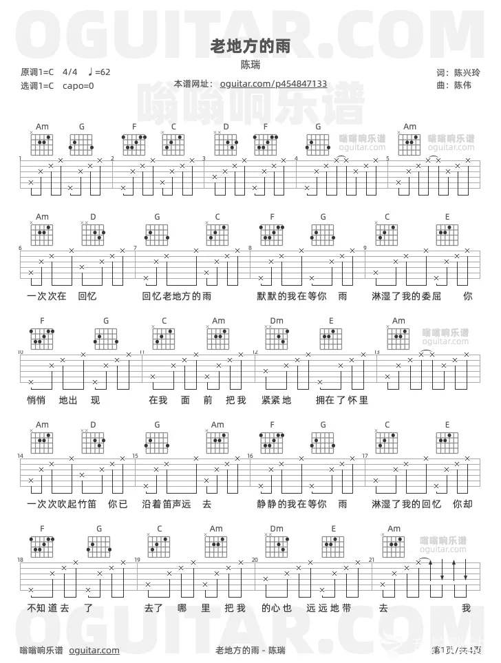 曲谱介绍: 陈瑞《老地方的雨》吉他弹唱谱,共有3张高清图谱。