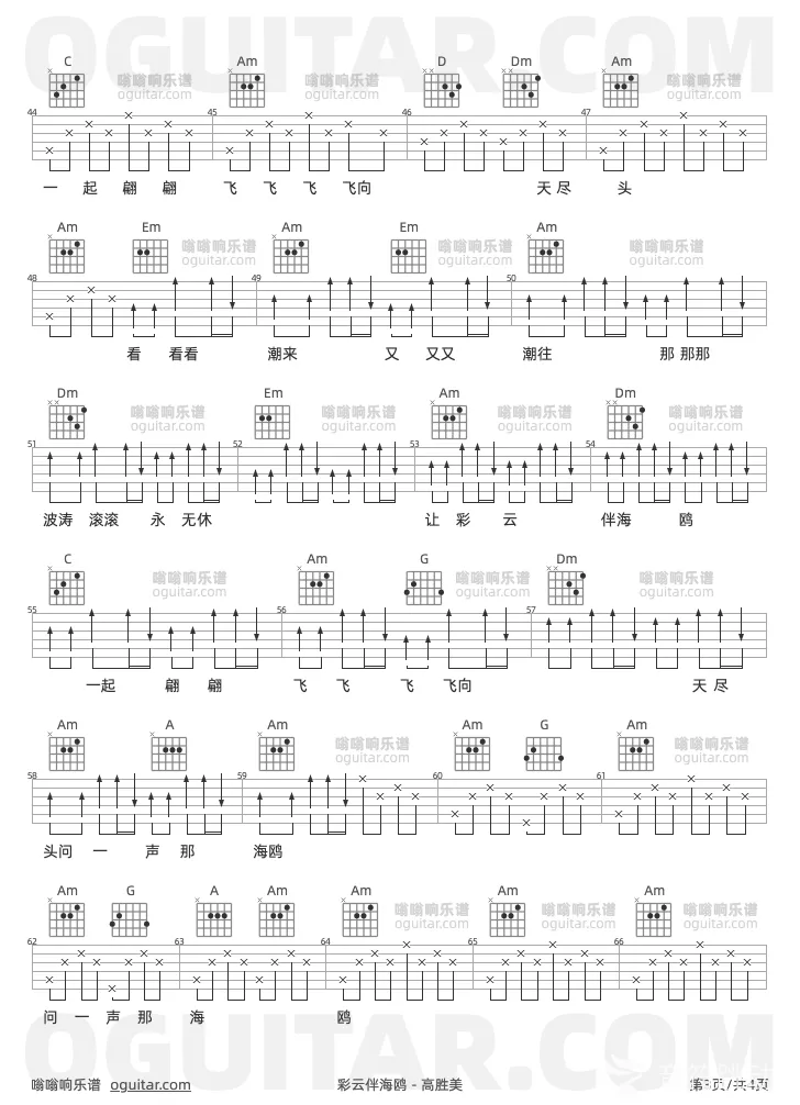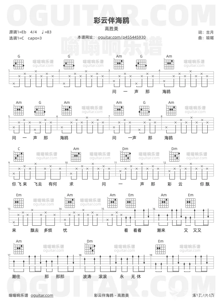 曲谱介绍: 高胜美《彩云伴海鸥》吉他弹唱谱,共有3张高清图谱。