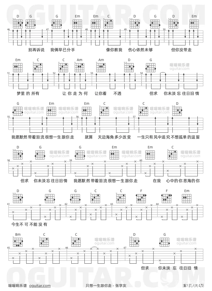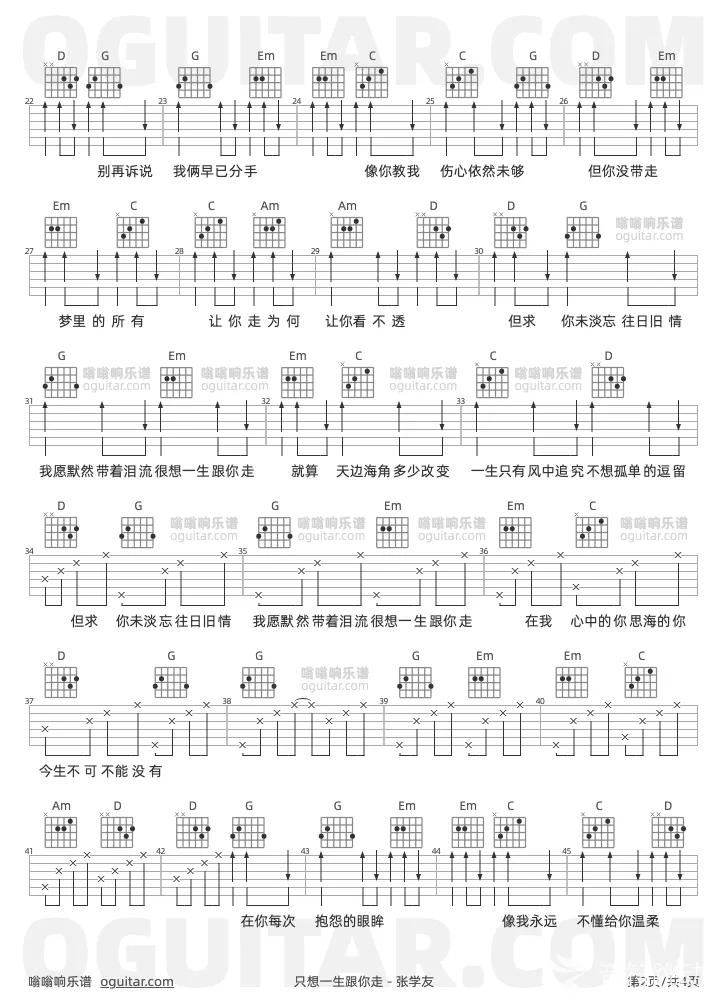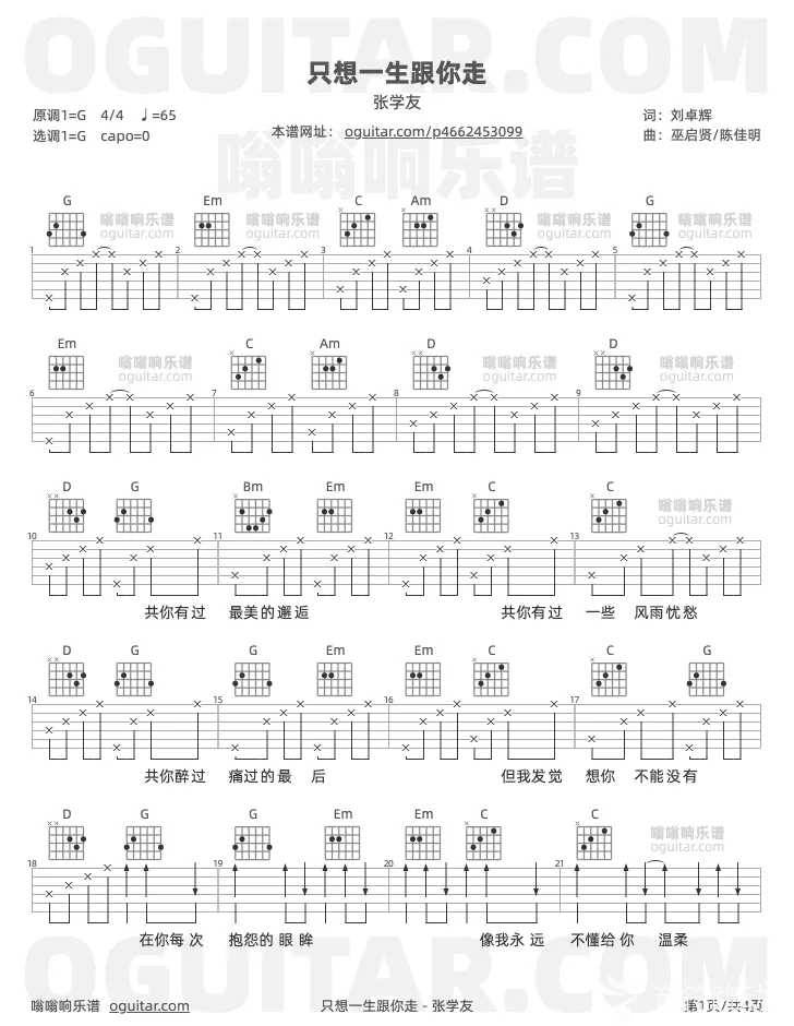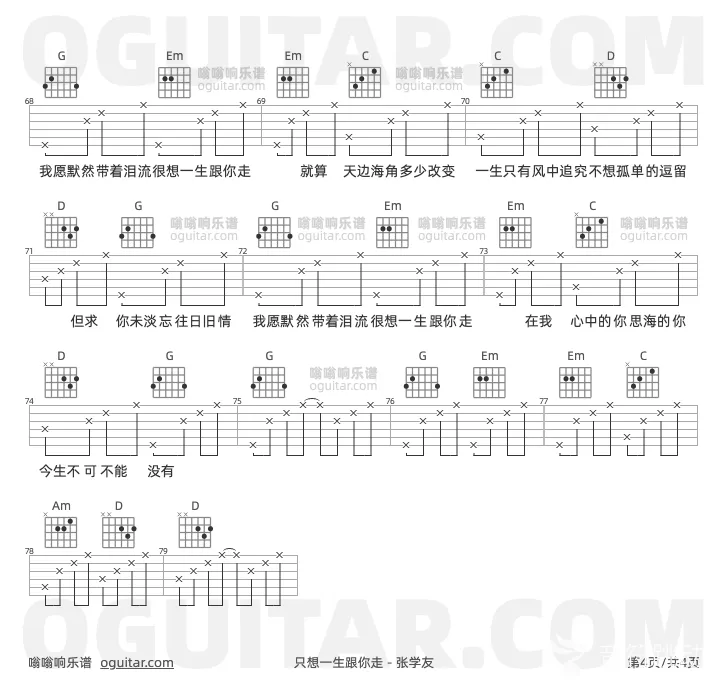 曲谱介绍: 张学友《只想一生跟你走》吉他弹唱谱,共有4张高清图谱。