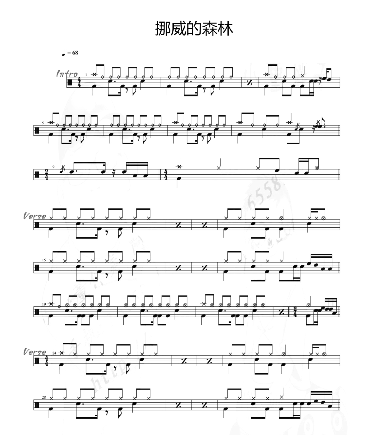 曲谱介绍: 挪威的森林(架子鼓谱)-伍佰