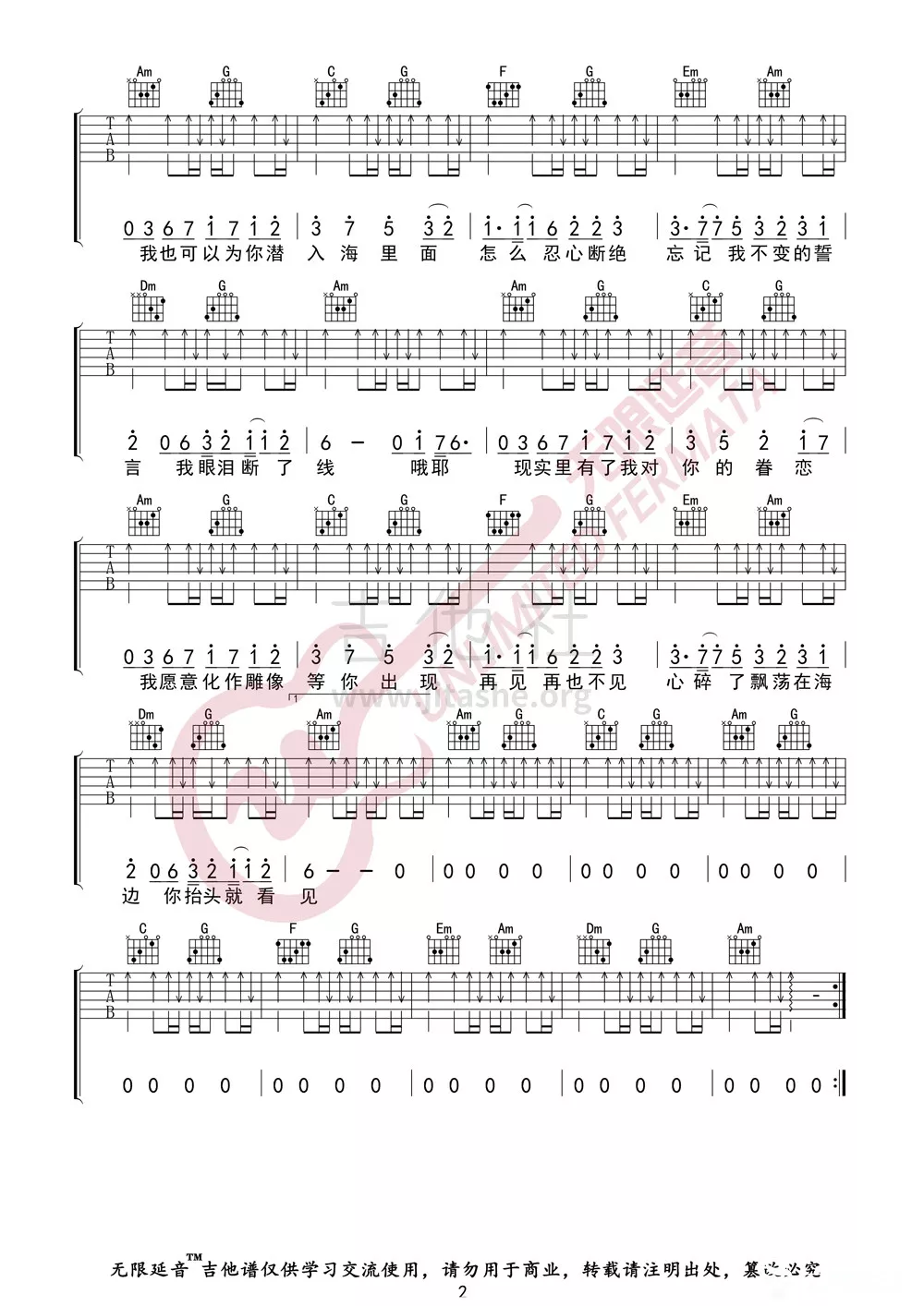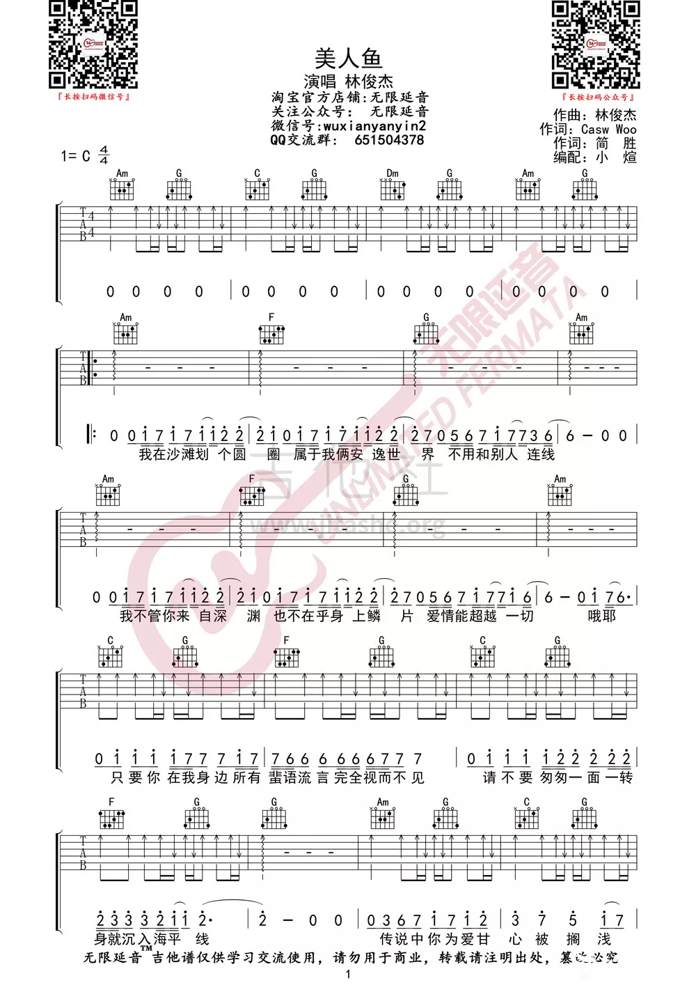 曲谱介绍: 林俊杰《美人鱼》吉他弹唱谱,采用C调指法编配,无限延音编配出品,共有2张高清图谱,免翻页排版设计。
