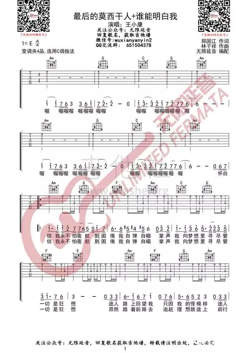 最后的莫西干人+谁能明白我吉他谱 - 王小康 - C调吉他弹唱谱