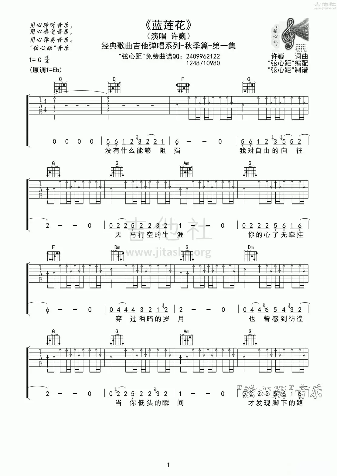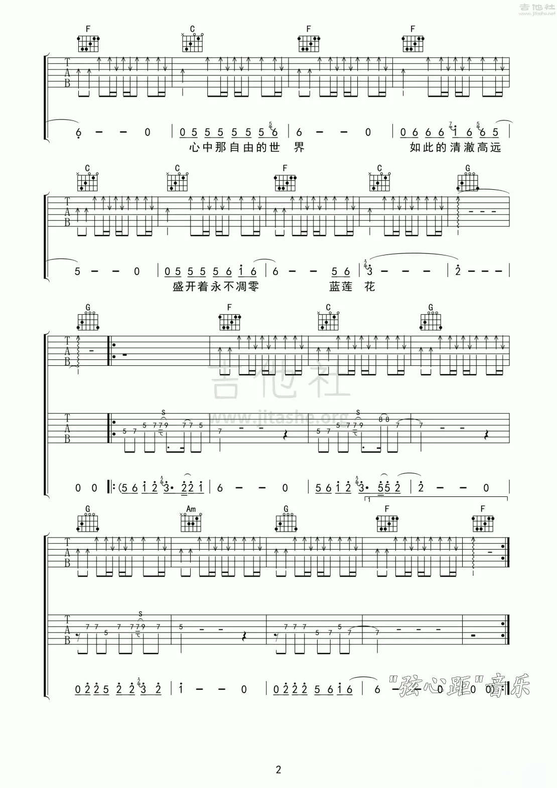 曲谱介绍: 许巍《蓝莲花》吉他弹唱谱,采用C调指法编配扫弦,共有2张高清图谱,免翻页排版设计。