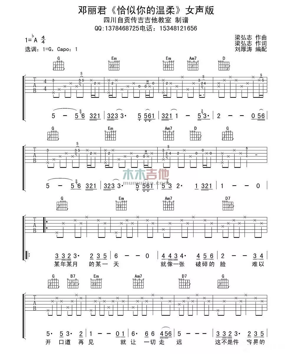 曲谱介绍: 邓丽君《恰似你的温柔》吉他弹唱谱,共有3张高清图谱。