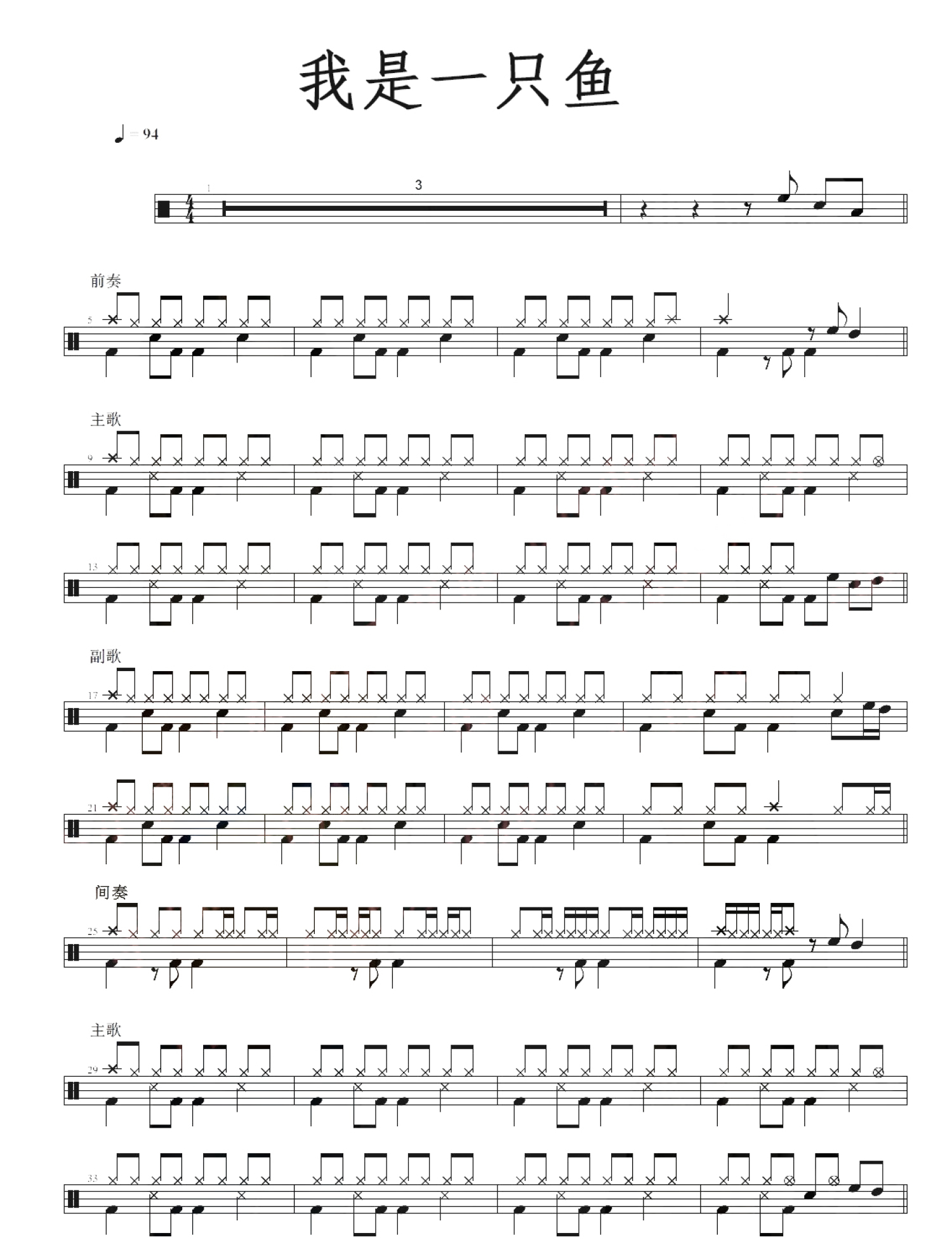 曲谱介绍: 我是一只鱼(架子鼓谱)-任贤齐