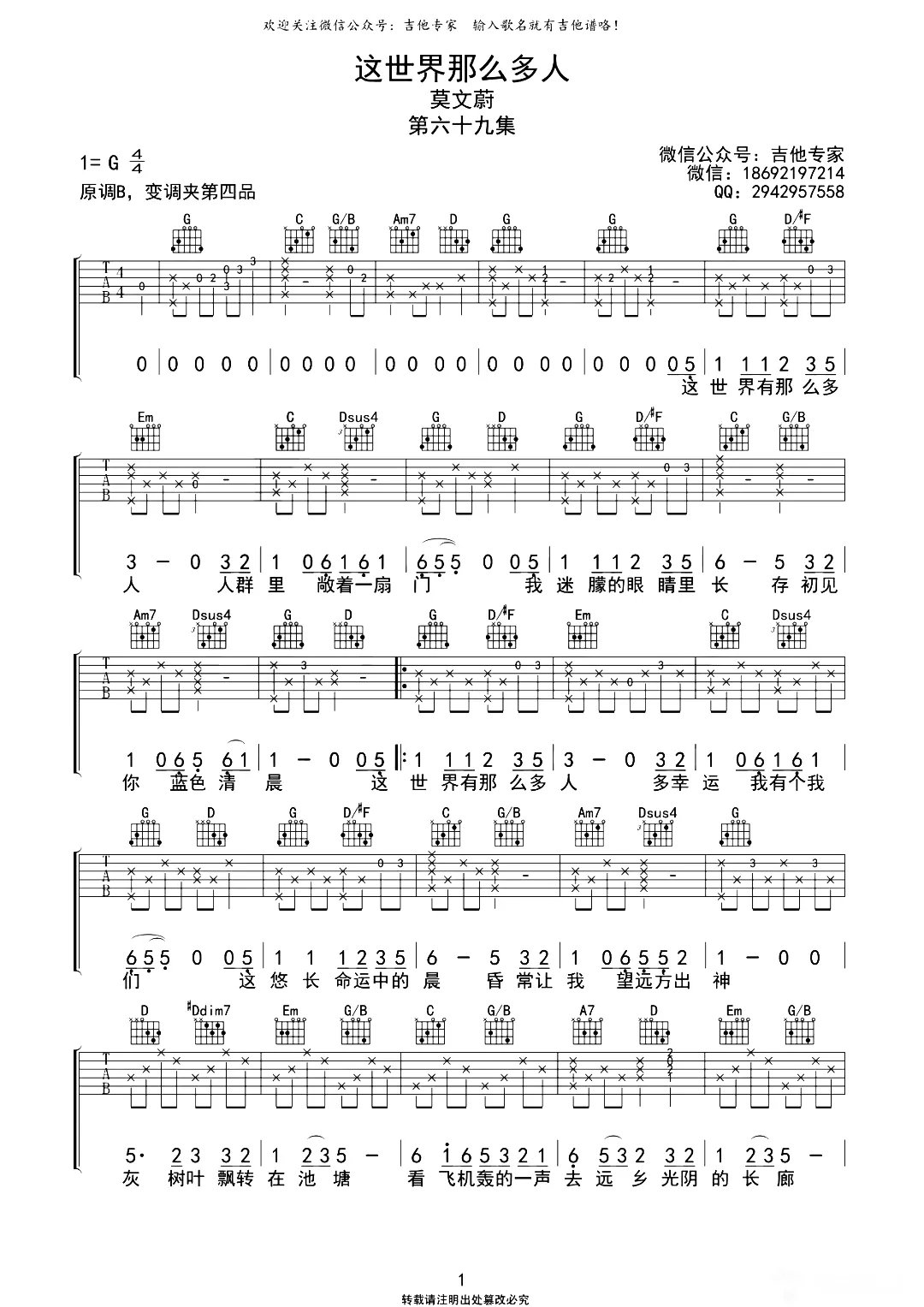 曲谱介绍: 莫文蔚《这世界那么多人》吉他弹唱谱,采用C调指法编配弹唱,共有2张高清图谱,免翻页排版设计。