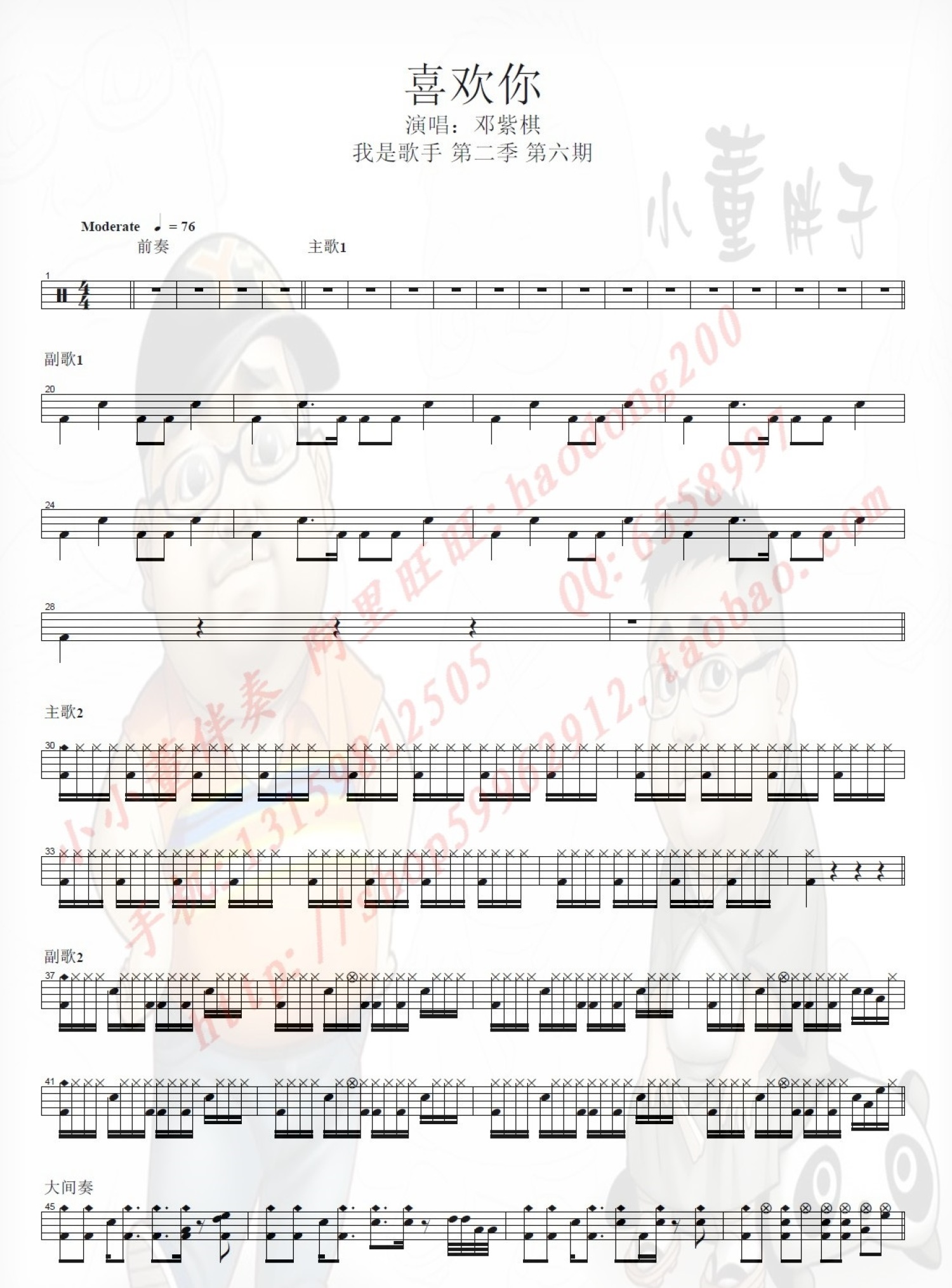 曲谱介绍: 喜欢你(架子鼓谱)-邓紫棋