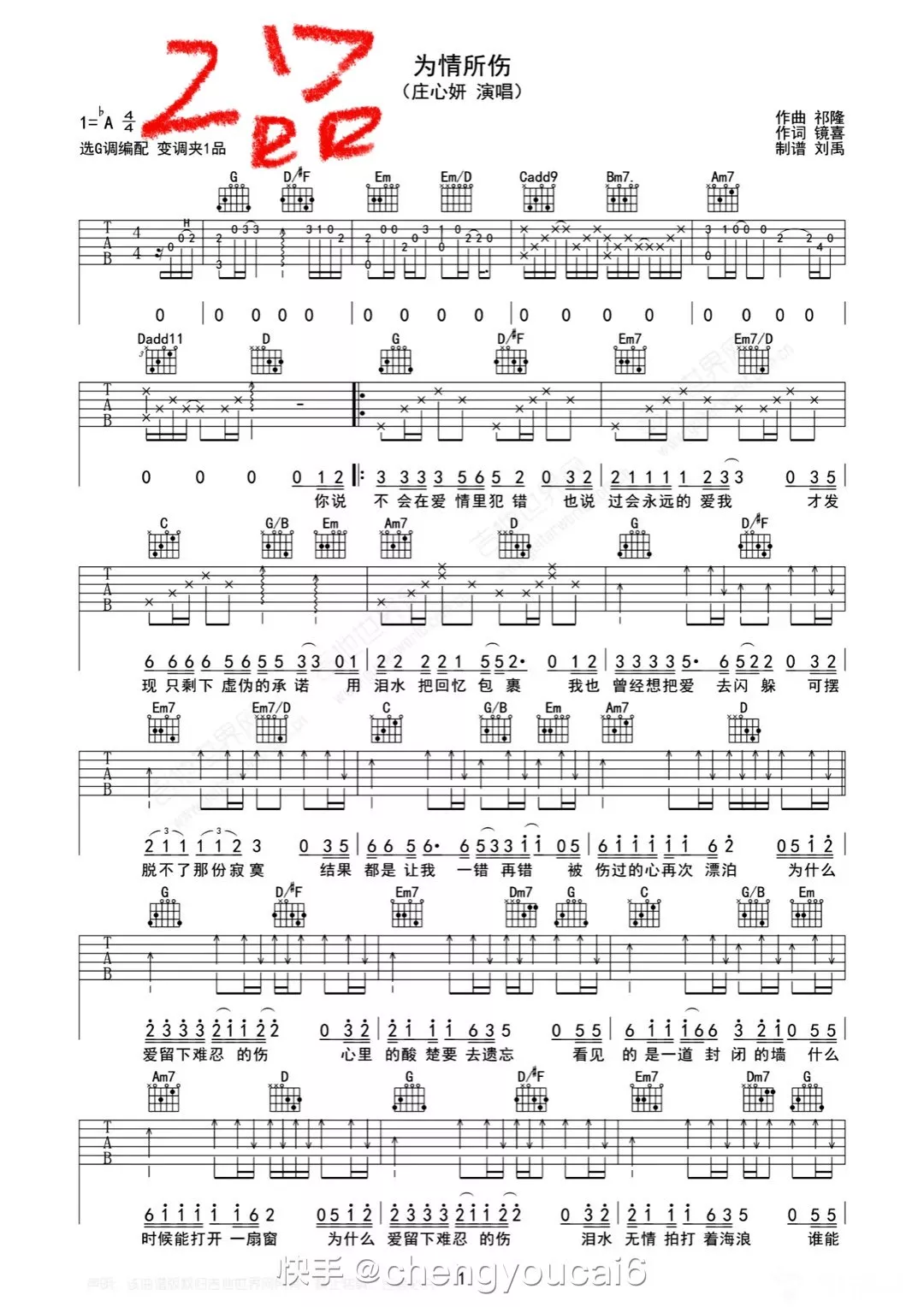 曲谱介绍: 庄心妍《为情所伤》吉他弹唱谱,共有2张高清图谱,免翻页排版设计。