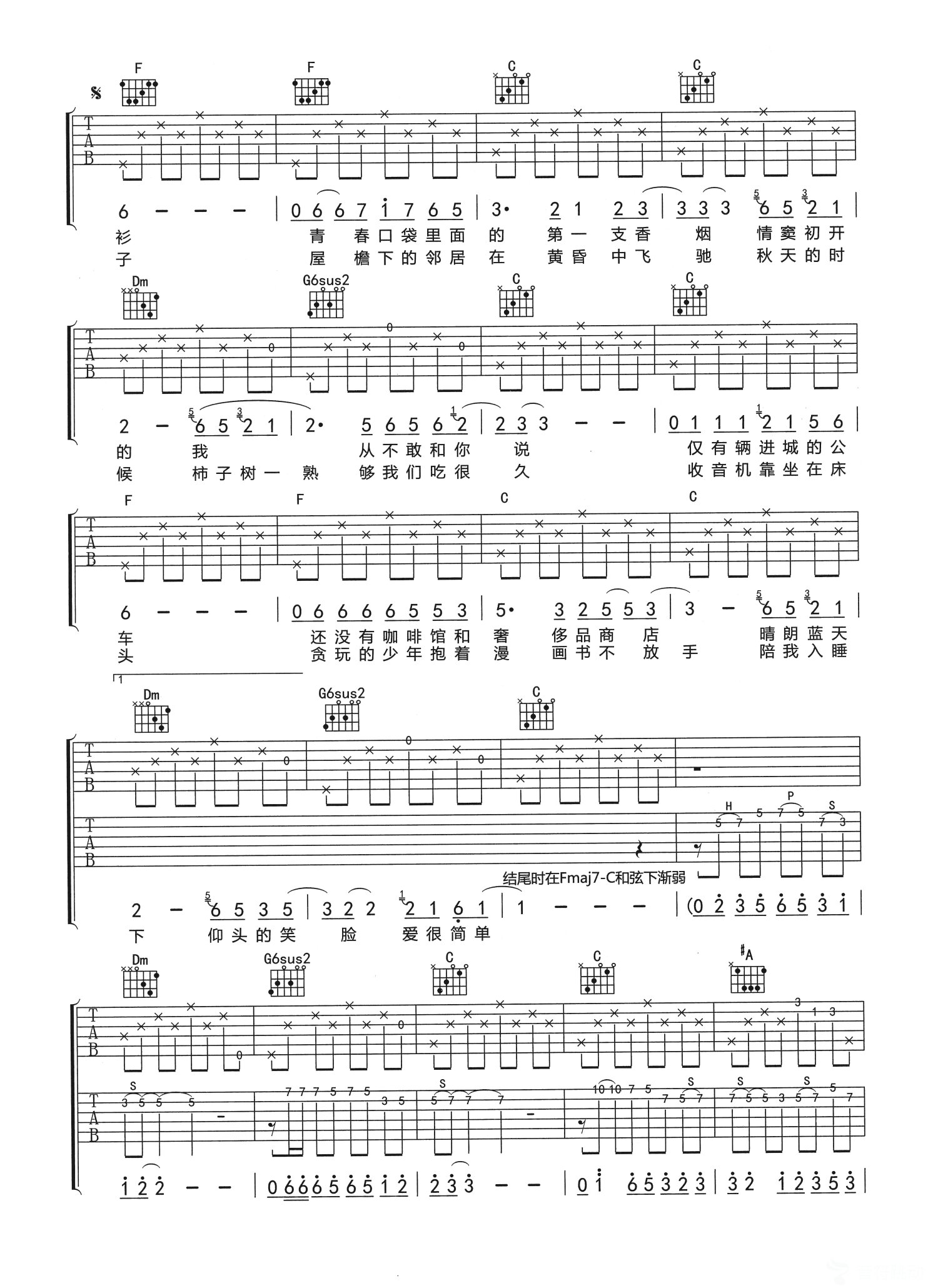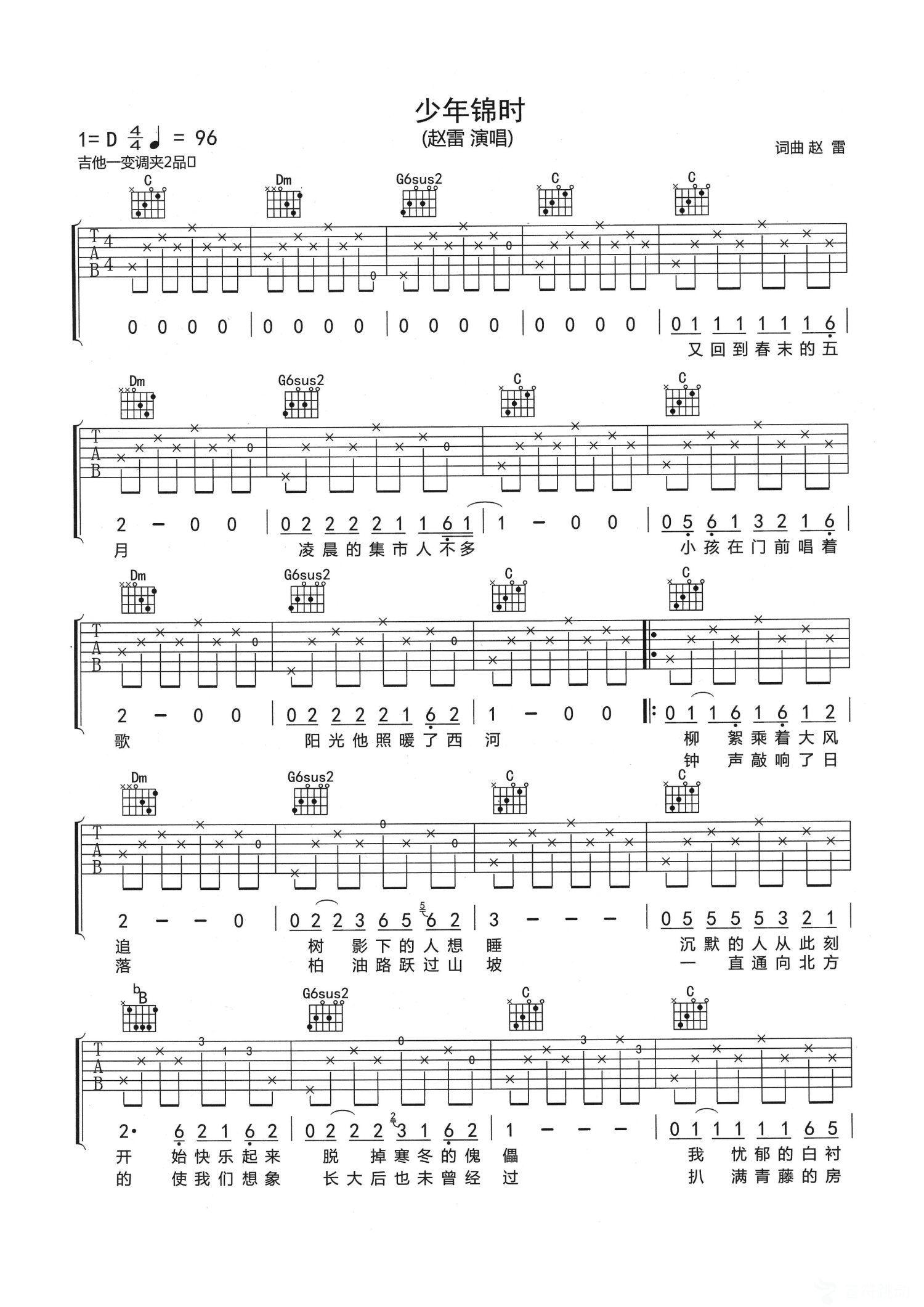 曲谱介绍: 赵雷《少年锦时》吉他弹唱谱,采用C调指法编配,共有3张高清图谱。