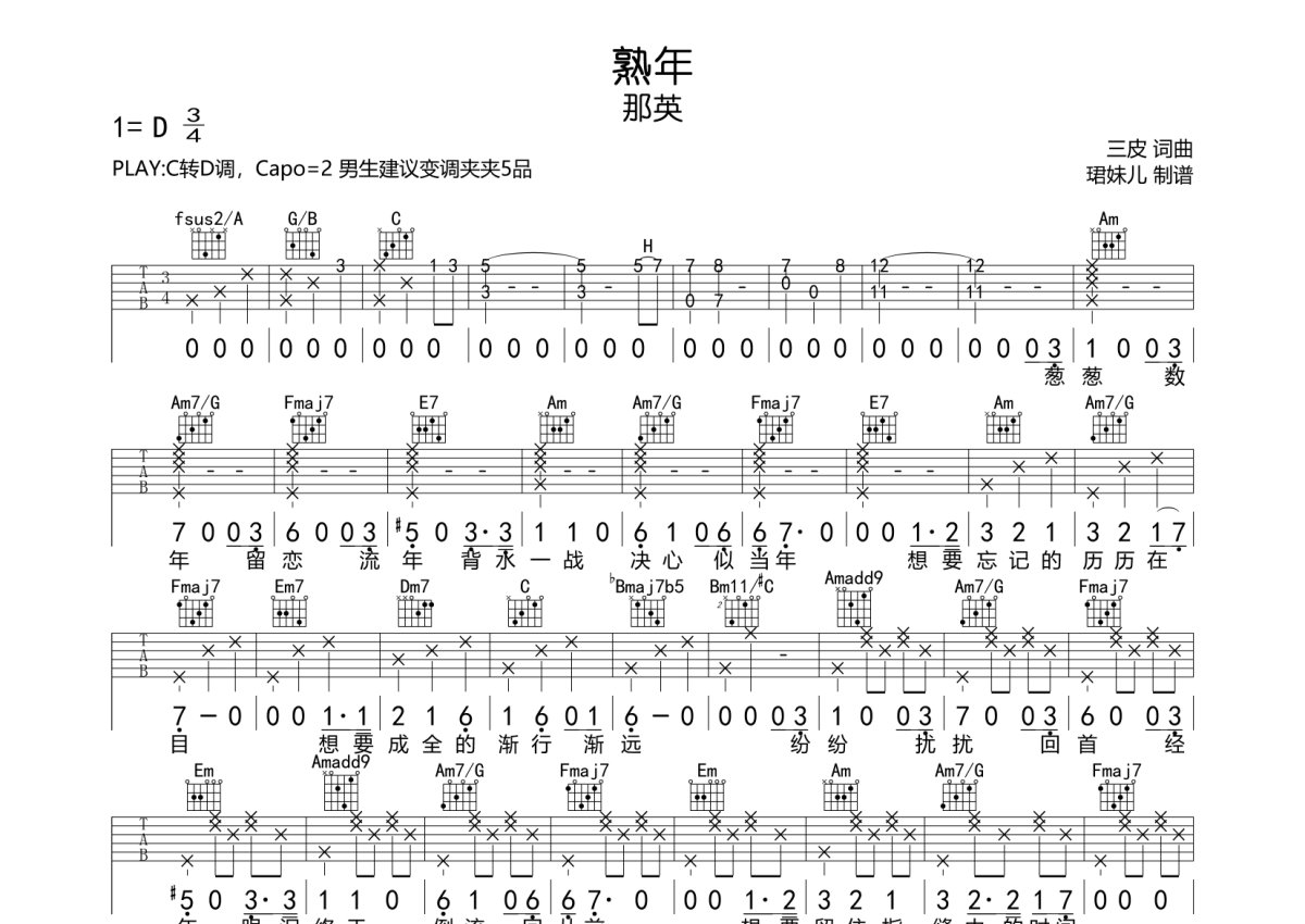曲谱介绍: 那英《熟年》吉他弹唱谱,采用C调指法编配,珺妹儿编配出品,共有2张高清图谱,免翻页排版设计。