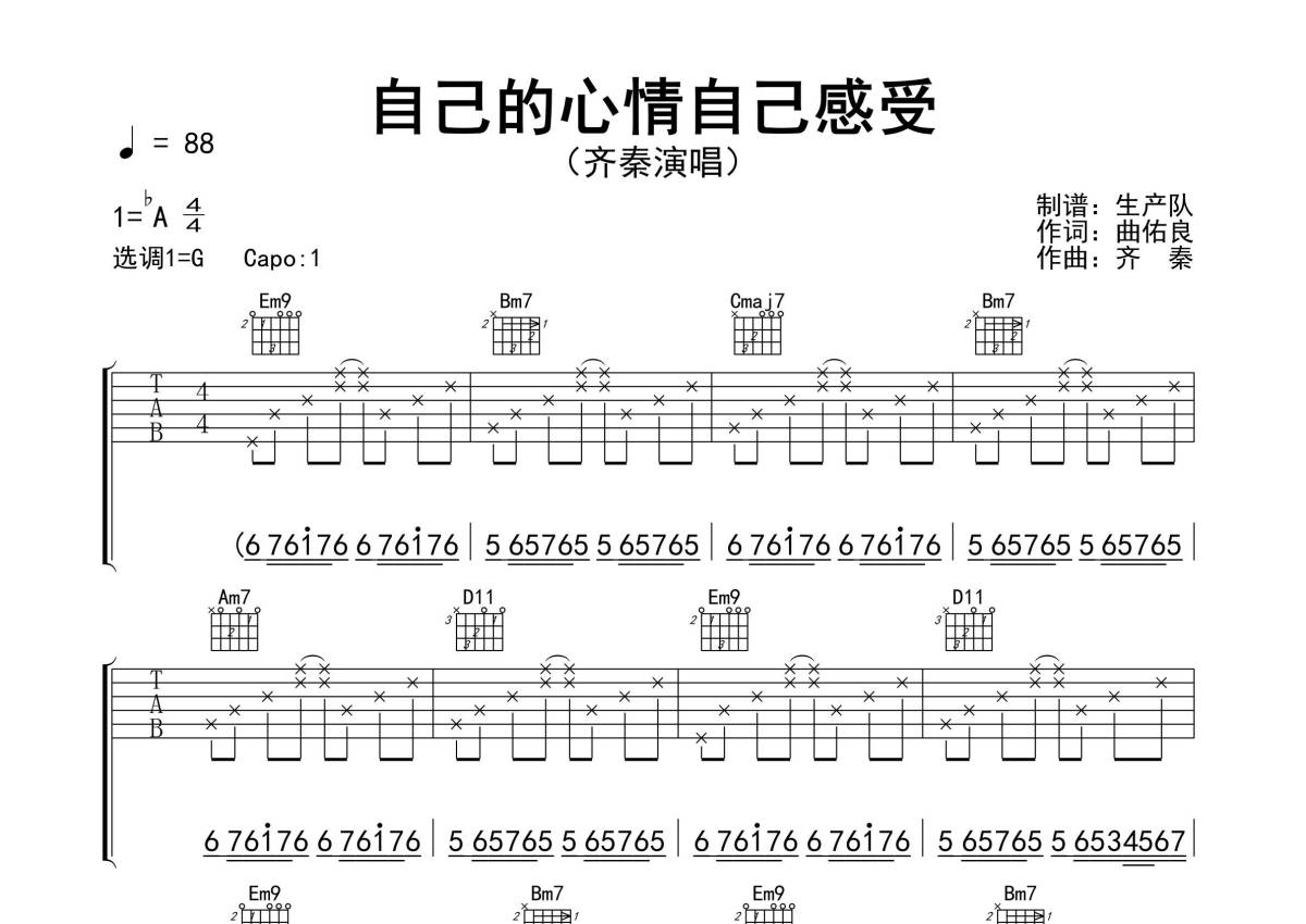 曲谱介绍: 齐秦《自己的心情自己感受》吉他弹唱谱,采用G调指法编配精编民谣版,生产队编配出品,共有3张高清图谱。
