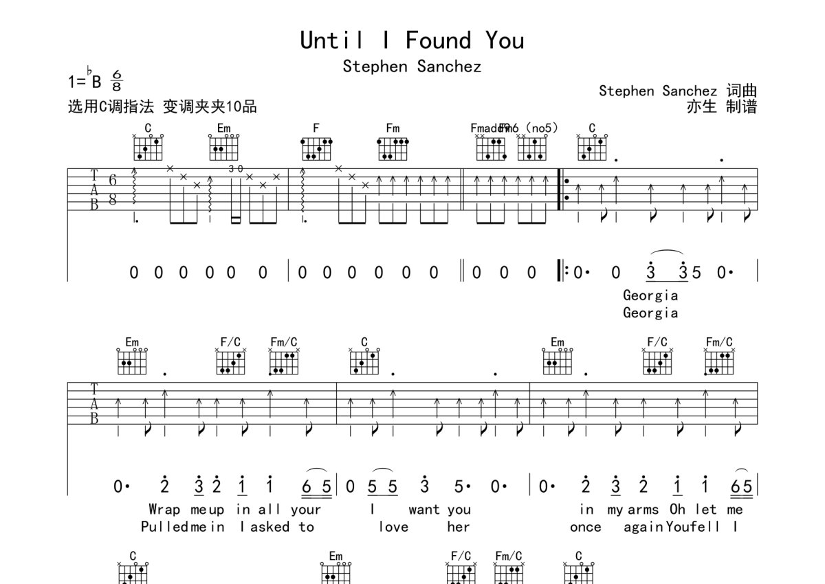 曲谱介绍: StephenSanchez《UntilIFoundYou》吉他弹唱谱,采用C调指法编配,亦生编配出品,共有2张高清图谱,免翻页排版设计。