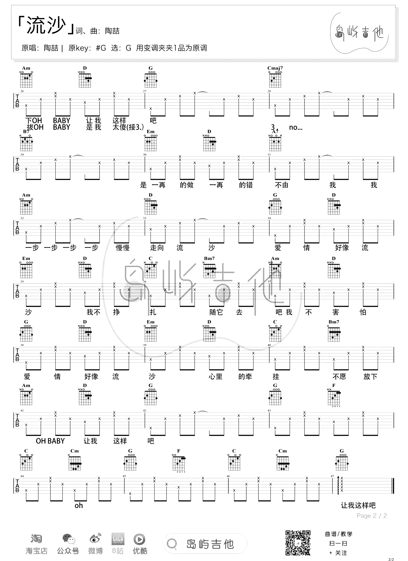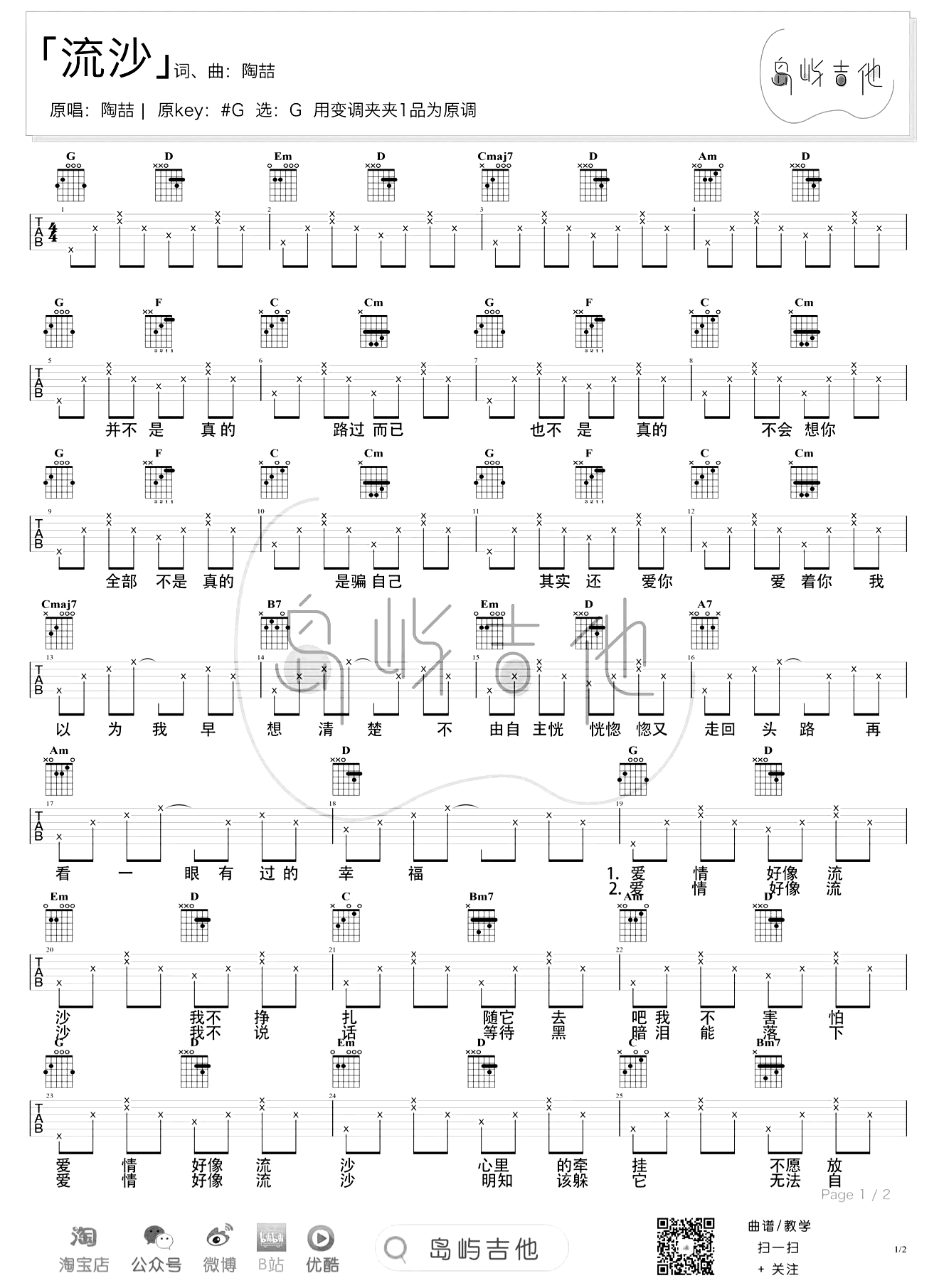 曲谱介绍: 流沙吉他谱,陶匆皇拙R&B歌曲。爱情好像流沙,让人越陷越深。《流沙》吉他弹唱六线谱,选用G调指法编配,变调夹第一品,六线谱共两张图片,感谢岛屿吉他制谱分享,琴谱网上传更新。 歌曲以流沙来映衬他对爱情的专一和无法自拔。让人深陷其中无法自拔,仿佛在平凡日子中积淀着一份珍贵的情感。明知应该躲避,早已明白与爱情无法有好结果,但又让自己沉溺其中,越陷越深。
