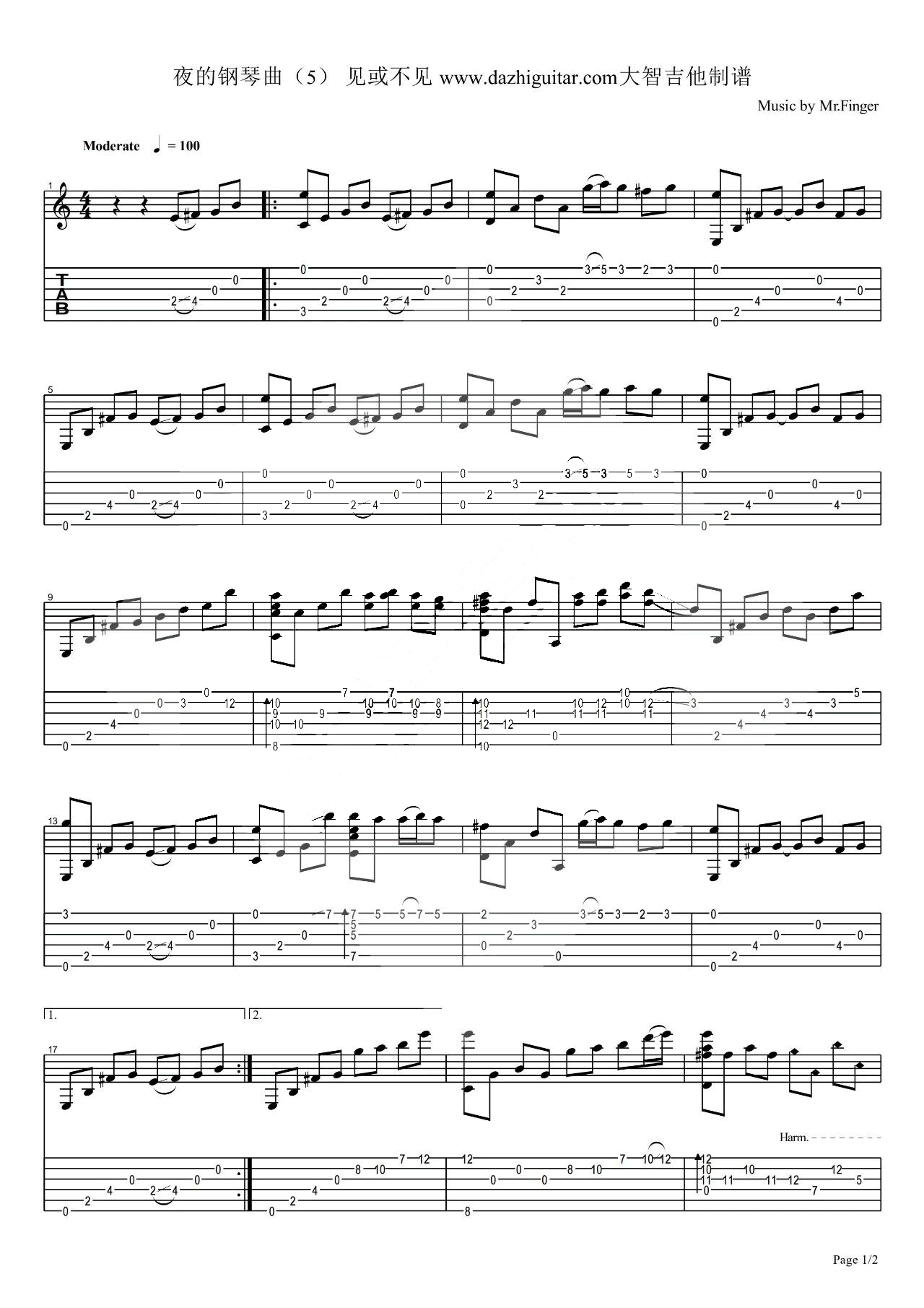 曲谱介绍: 夜的钢琴曲5指弹吉他谱,石进创作的夜的钢琴曲系列中的一首。旋律如水似诗像梦,更是一个奇迹。随谱附上配套吉他独奏演示视频。《夜的钢琴曲5》吉他独奏谱,六线谱共两张图片,感谢大智吉他出品,琴谱网上传。 宁静和缓,心灵在诗意中安顿,触动人心,细细聆听,你会感受到,音符中蕴含着深沉的忧伤,如溪水般潺潺,如海风般轻拂,如忧伤在安静中泛起涟漪。恍若置身幽暗中,静谧悠然,安静地相思,静静地遗忘,音符在黑夜中跳动,带走了岁月的尘烟。