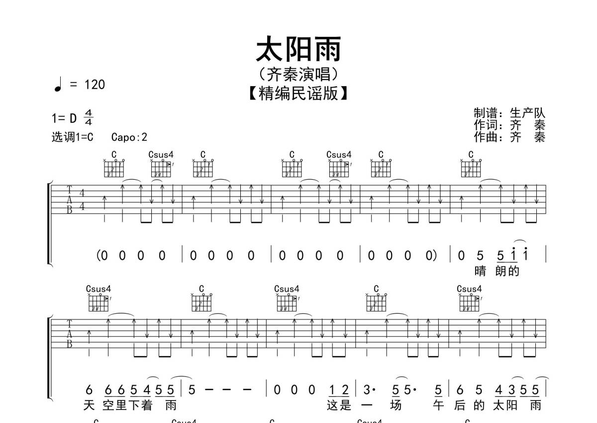 曲谱介绍: 齐秦《太阳雨》吉他弹唱谱,采用C调指法编配精编民谣版,生产队编配出品,共有3张高清图谱。