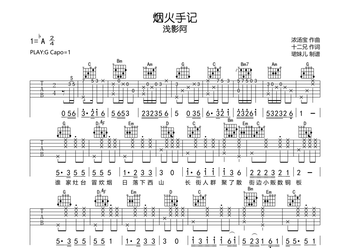 • 烟火手记吉他谱 - 浅影阿 - G调吉他弹唱谱第1张