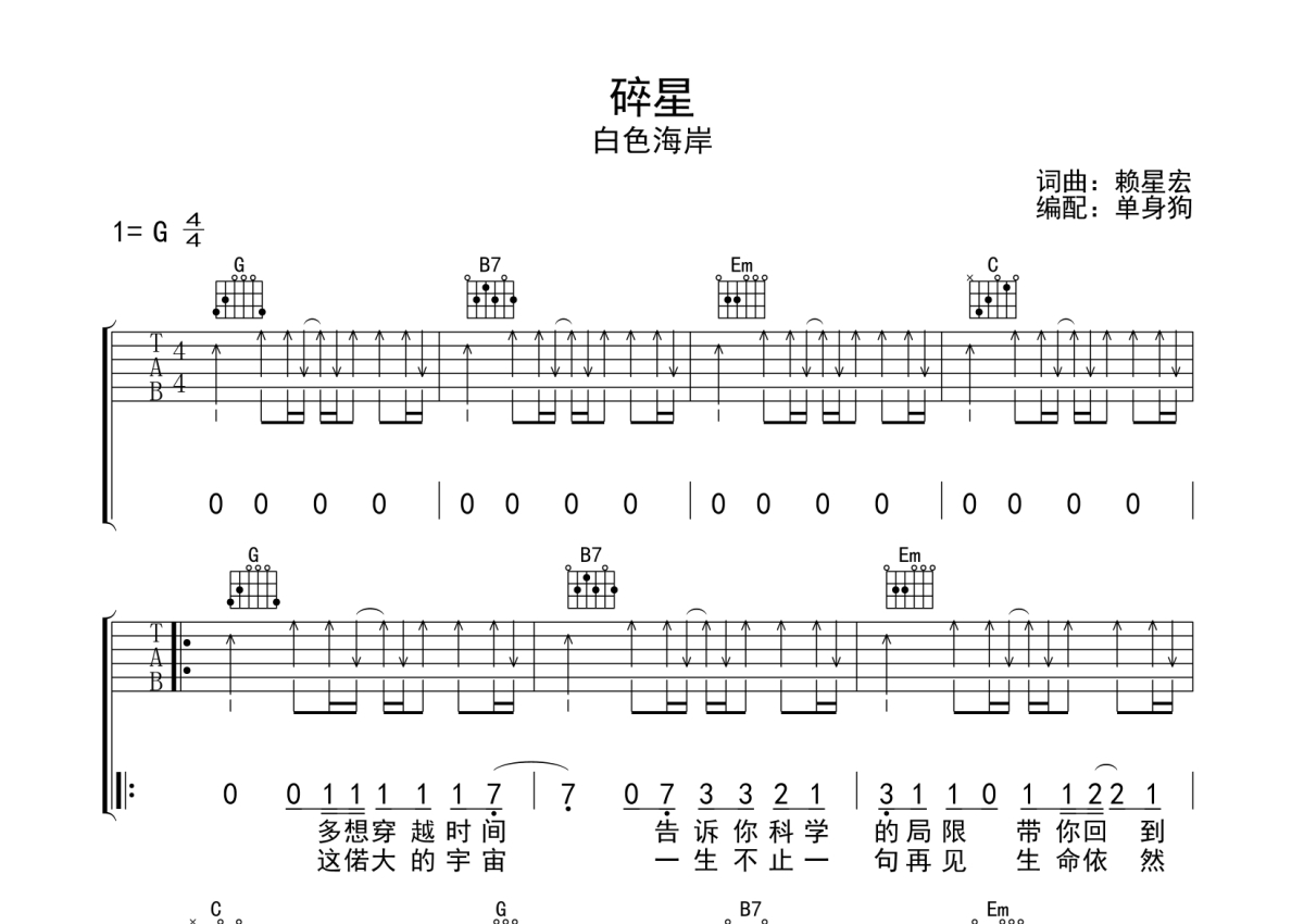 曲谱介绍: 白色海岸《碎星》吉他弹唱谱,采用G调指法编配,单身狗编配出品,共有3张高清图谱。